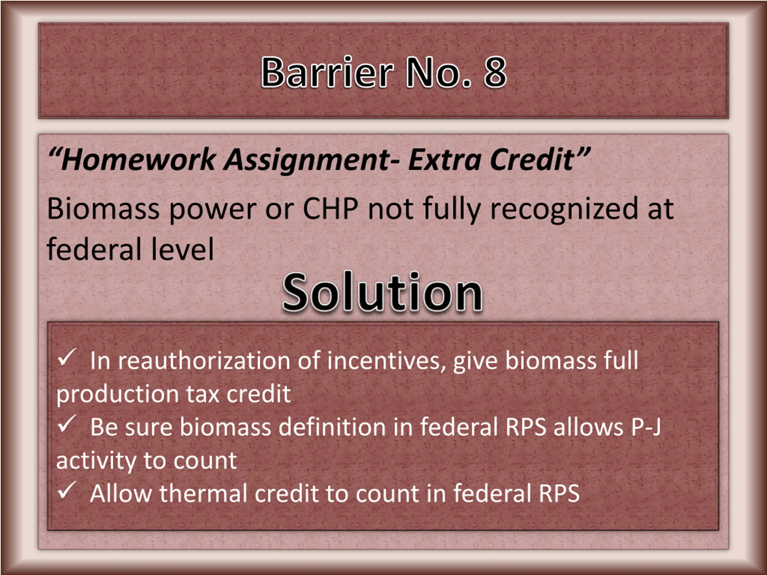 Barrier No. 8 Homework Assignment- Extra Credit Biomass power or CHP not fully recognized at federal level In reauthorization of incentives, give biomass full production tax credit Be sure biomass definition in federal RPS allows P-J activity to count Allow thermal credit to count in federal RPS