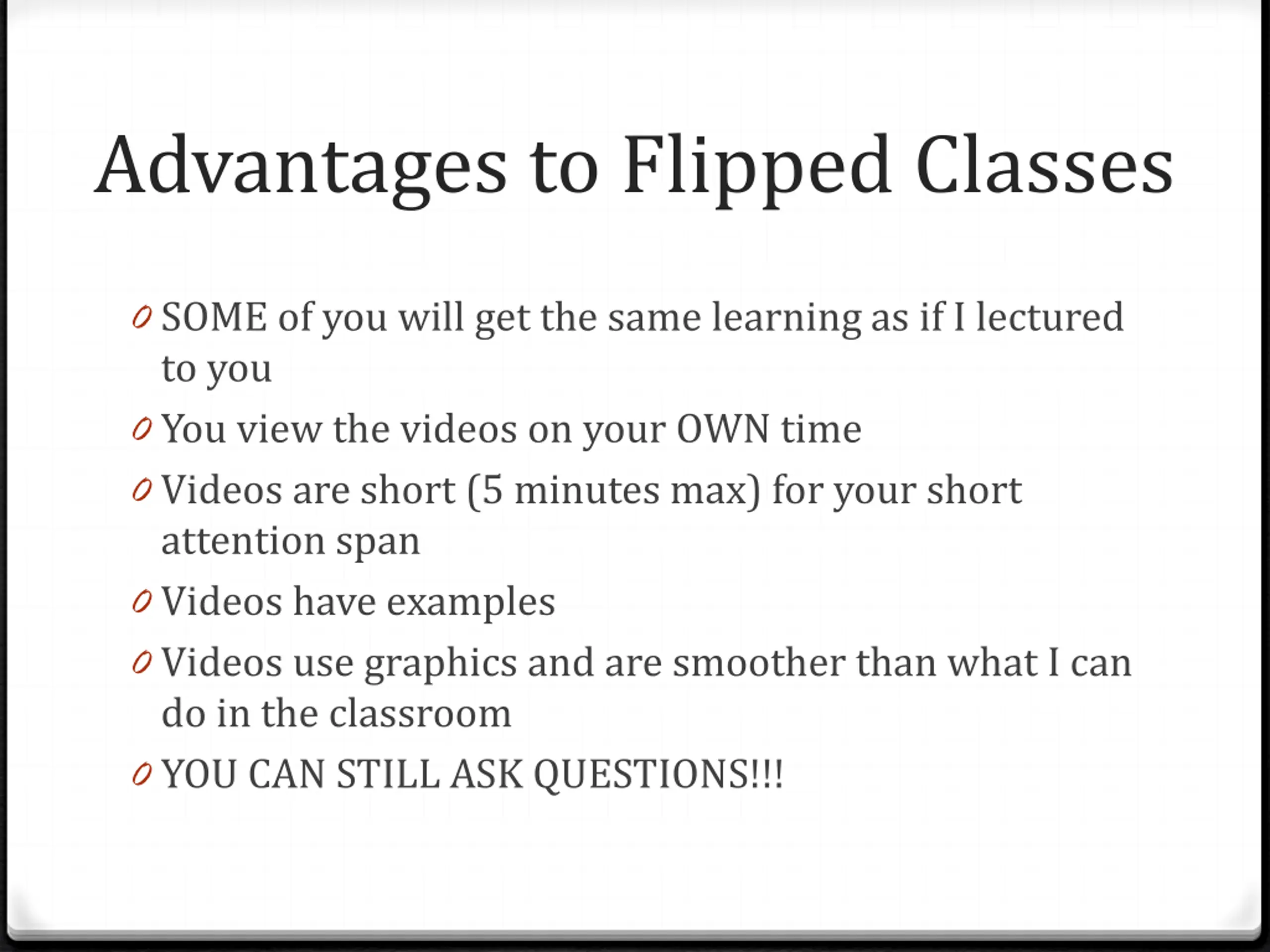 Advantages to Flipped Classes 0 SOME of you will get the same learning as if I lectured to you 0 You view the videos on your OWN time 0 Videos are short (5 minutes max) for your short attention span 0 Videos have examples 0 Videos use graphics and are smoother than what I can do in the classroom 0 YOU CAN STILL ASK QUESTIONS!!!