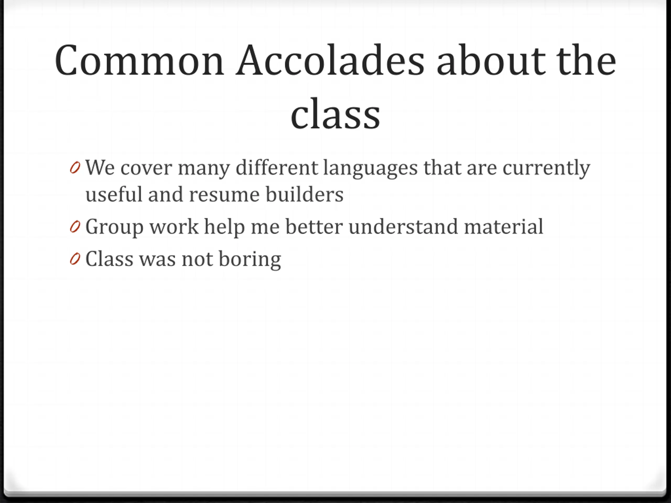 Common Accolades about the class 0 We cover many different languages that are currently useful and resume builders 0 Group work help me better understand material 0 Class was not boring