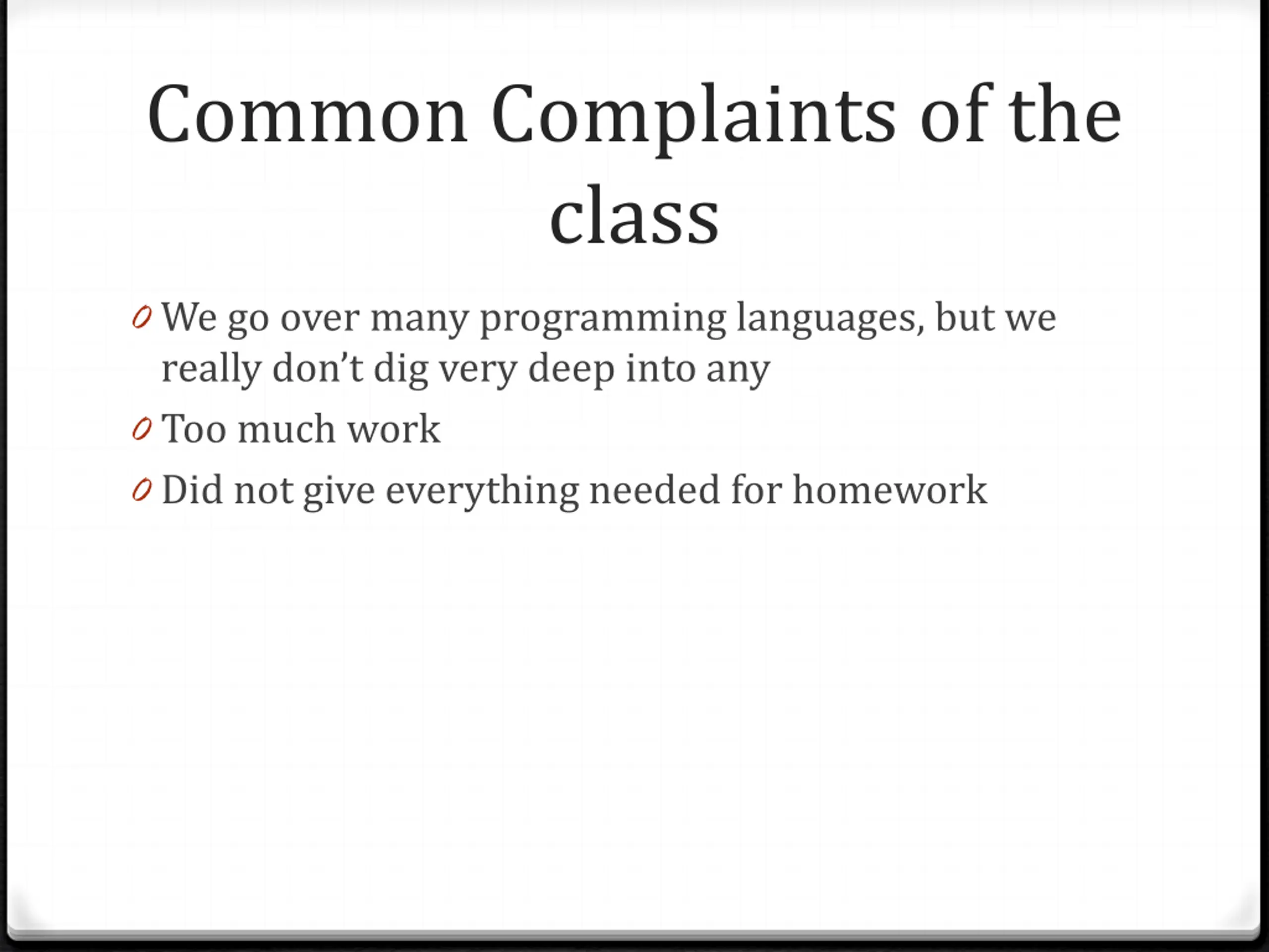 Common Complaints of the class 0 We go over many programming languages, but we really don t dig very deep into any 0 Too much work 0 Did not give everything needed for homework