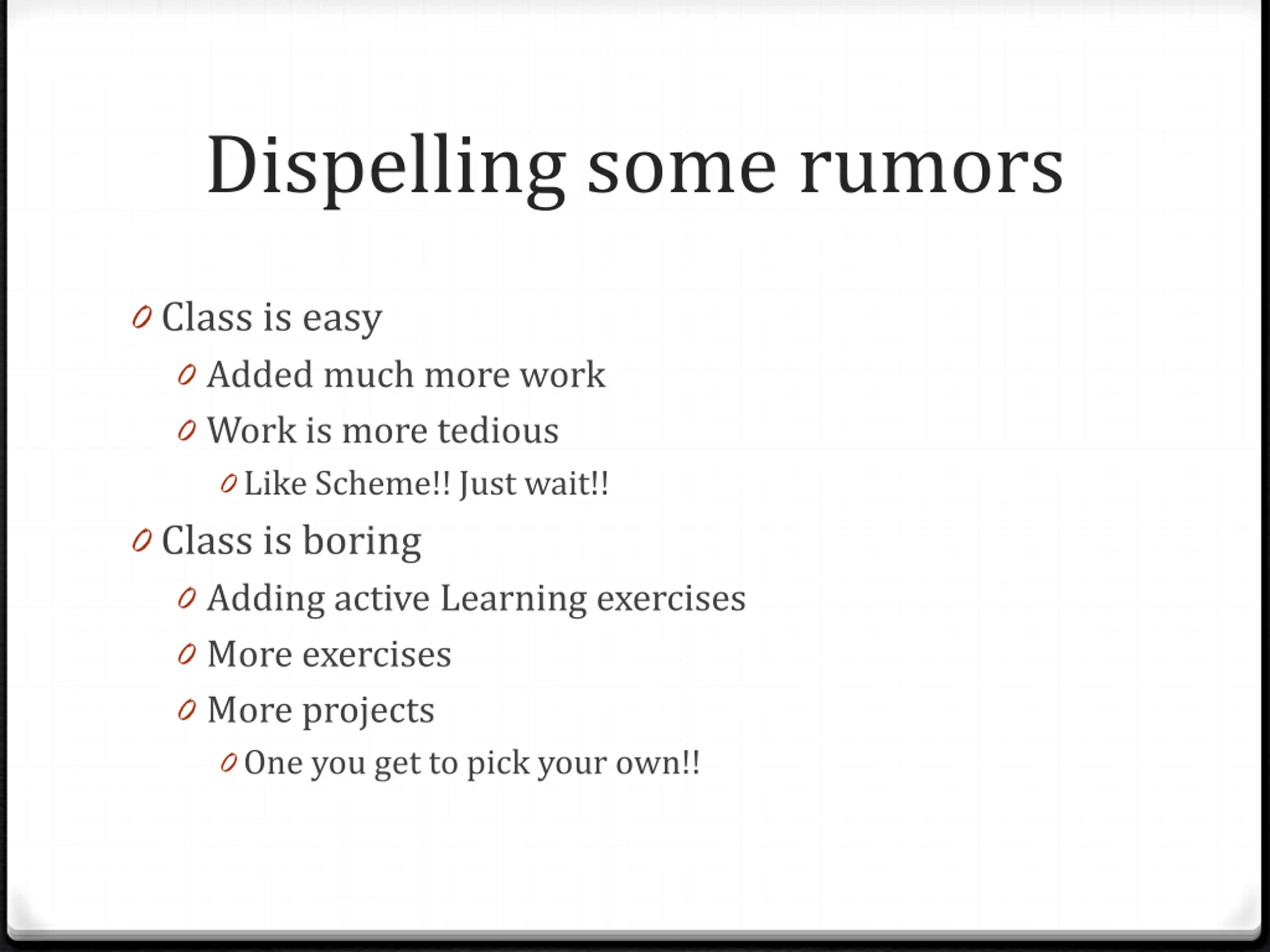 Dispelling some rumors 0 Class is easy 0 Added much more work 0 Work is more tedious 0 Like Scheme!! Just wait!! 0 Class is boring 0 Adding active Learning exercises 0 More exercises 0 More projects 0 One you get to pick your own!!