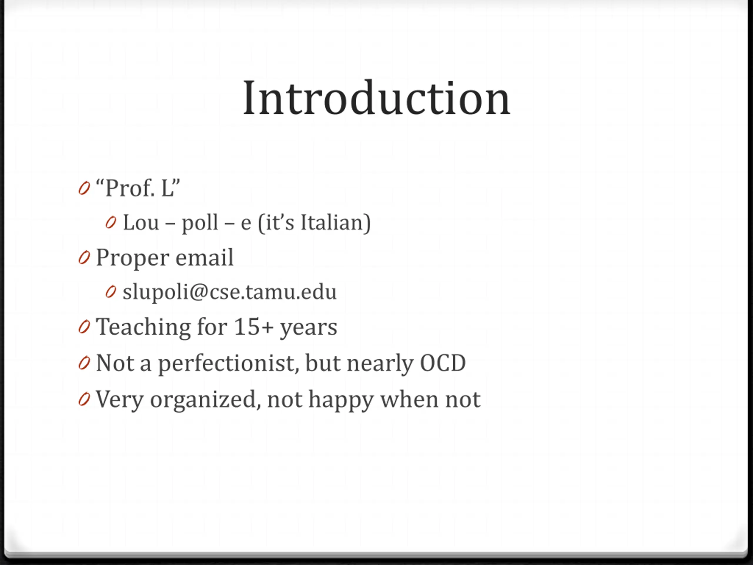 Introduction 0 Prof. L 0 Lou poll e (it s Italian) 0 Proper email 0 slupoli@cse.tamu.edu 0 Teaching for 15+ years 0 Not a perfectionist, but nearly OCD 0 Very organized, not happy when not