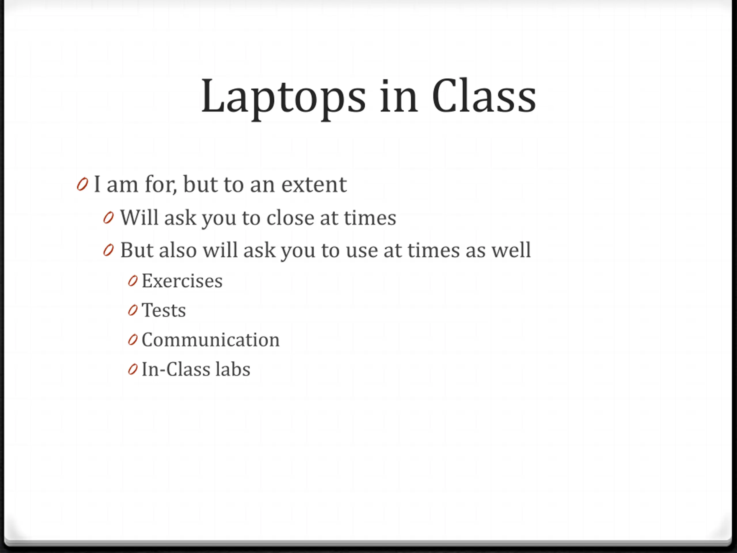 Laptops in Class 0 I am for, but to an extent 0 Will ask you to close at times 0 But also will ask you to use at times as well 0 Exercises 0 Tests 0 Communication 0 In-Class labs