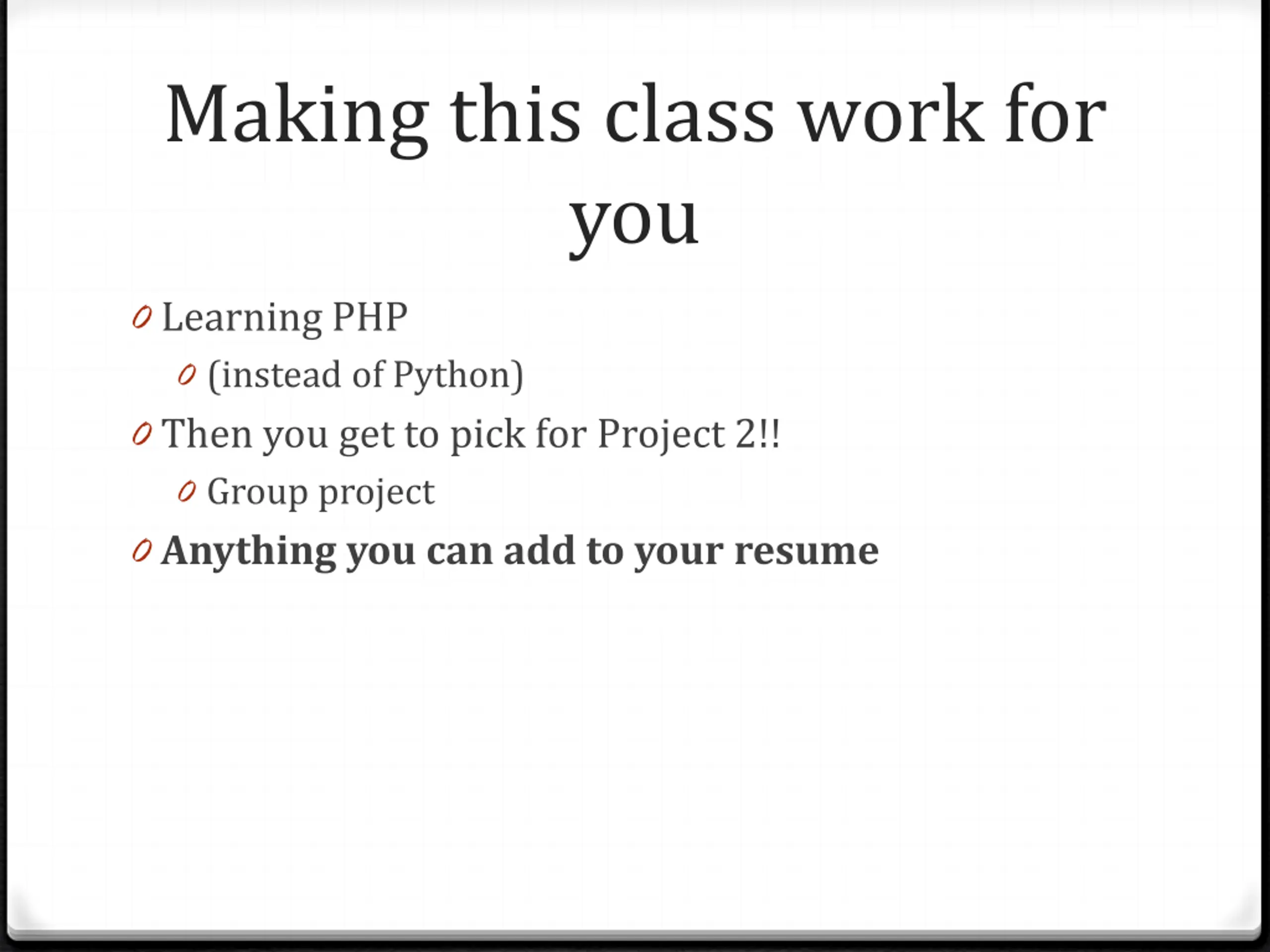Making this class work for you 0 Learning PHP 0 (instead of Python) 0 Then you get to pick for Project 2!! 0 Group project 0 Anything you can add to your resume