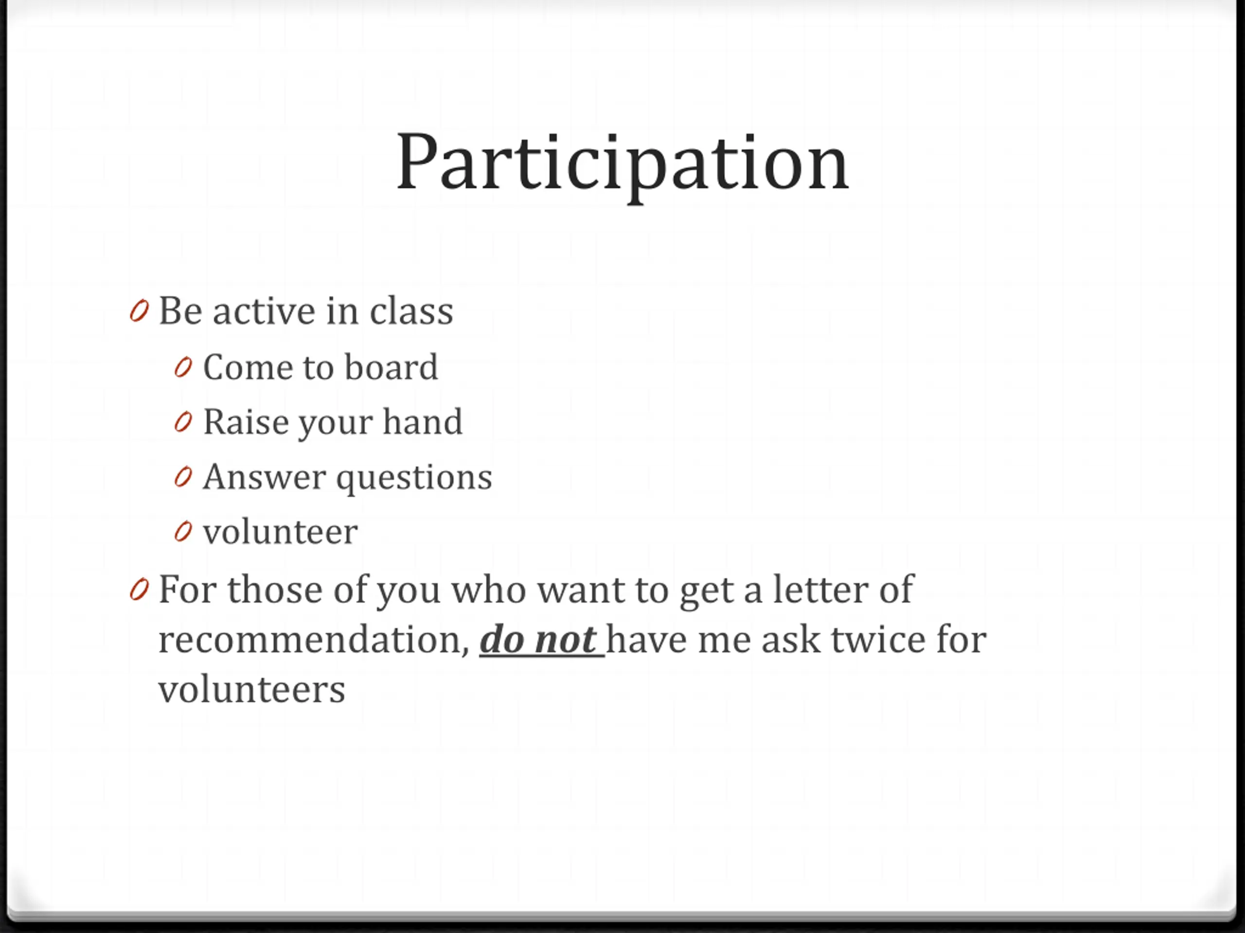 Participation 0 Be active in class 0 Come to board 0 Raise your hand 0 Answer questions 0 volunteer 0 For those of you who want to get a letter of recommendation, do not have me ask twice for volunteers