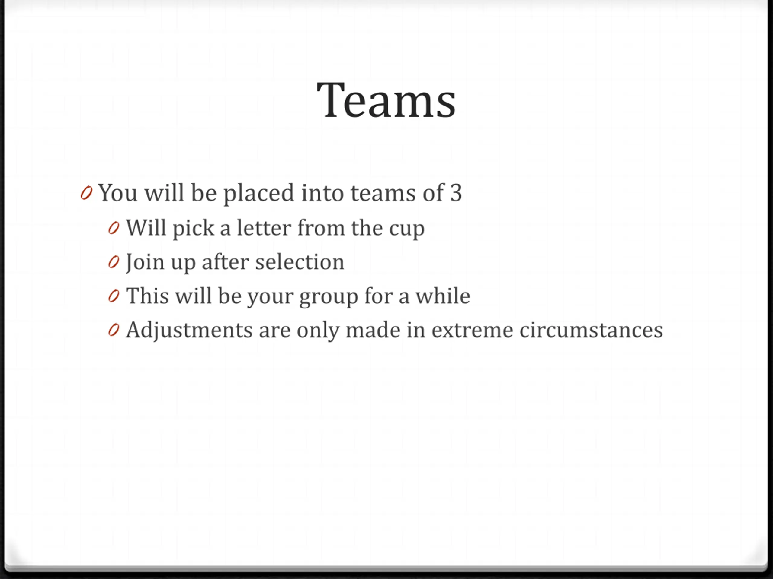 Teams 0 You will be placed into teams of 3 0 Will pick a letter from the cup 0 Join up after selection 0 This will be your group for a while 0 Adjustments are only made in extreme circumstances