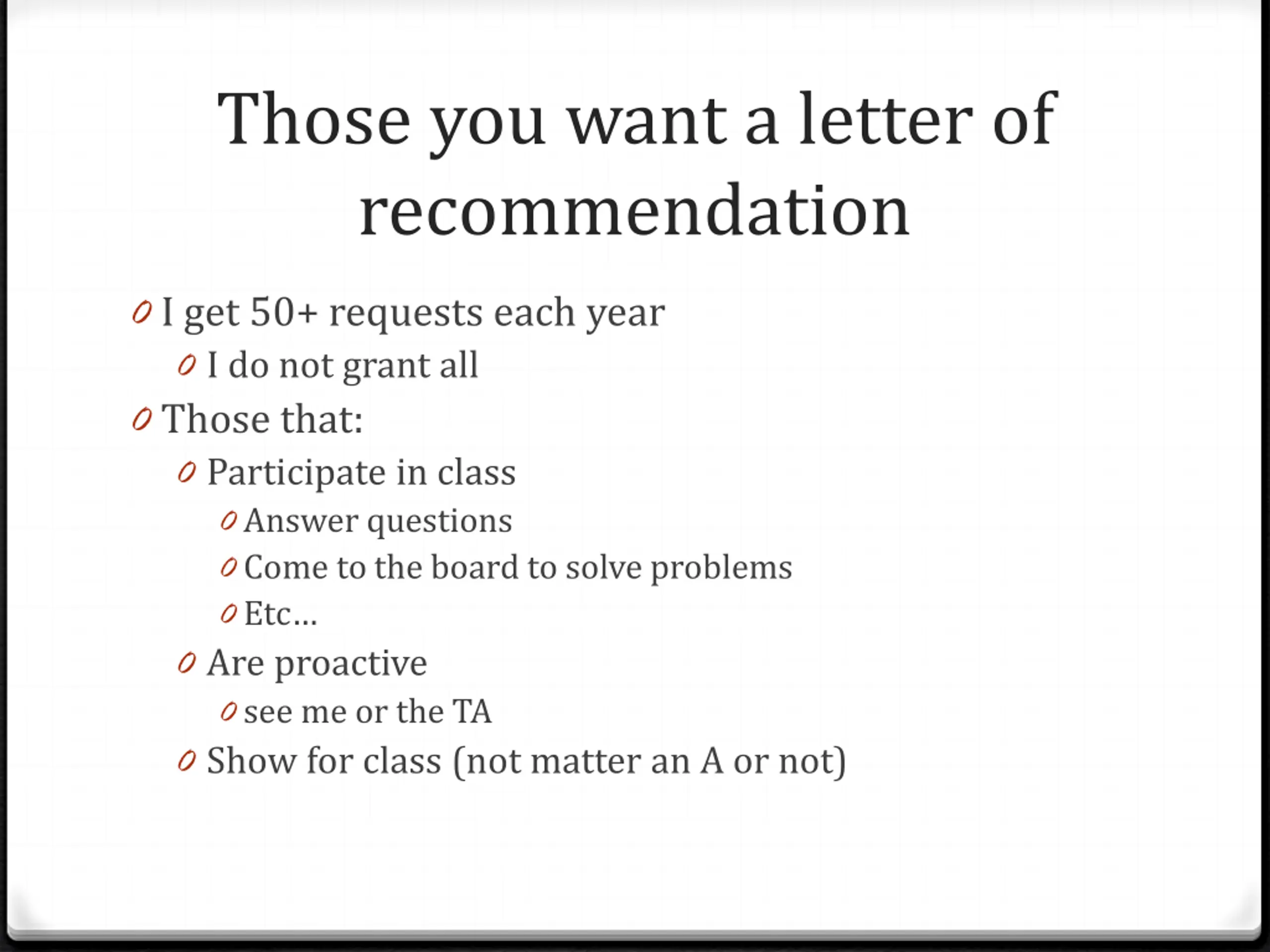 Those you want a letter of recommendation 0 I get 50+ requests each year 0 I do not grant all 0 Those that: 0 Participate in class 0 Answer questions 0 Come to the board to solve problems 0 Etc 0 Are proactive 0 see me or the TA 0 Show for class (not matter an A or not)
