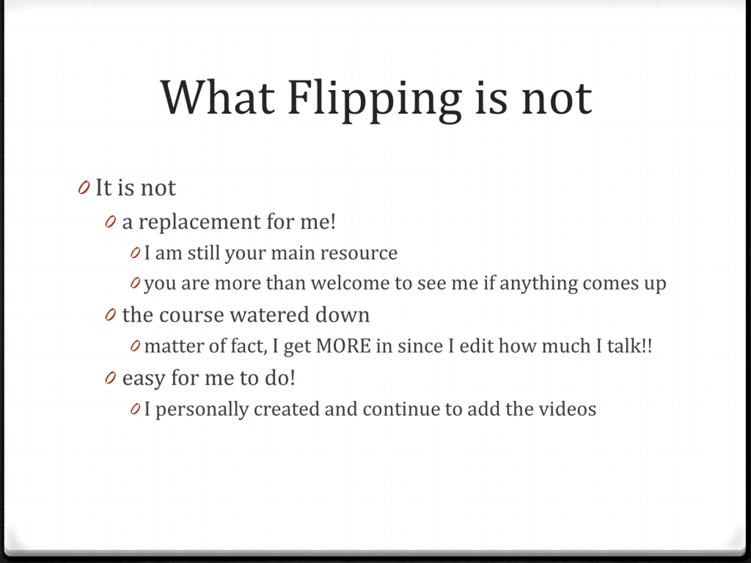 What Flipping is not 0 It is not 0 a replacement for me! 0 I am still your main resource 0 you are more than welcome to see me if anything comes up 0 the course watered down 0 matter of fact, I get MORE in since I edit how much I talk!! 0 easy for me to do! 0 I personally created and continue to add the videos