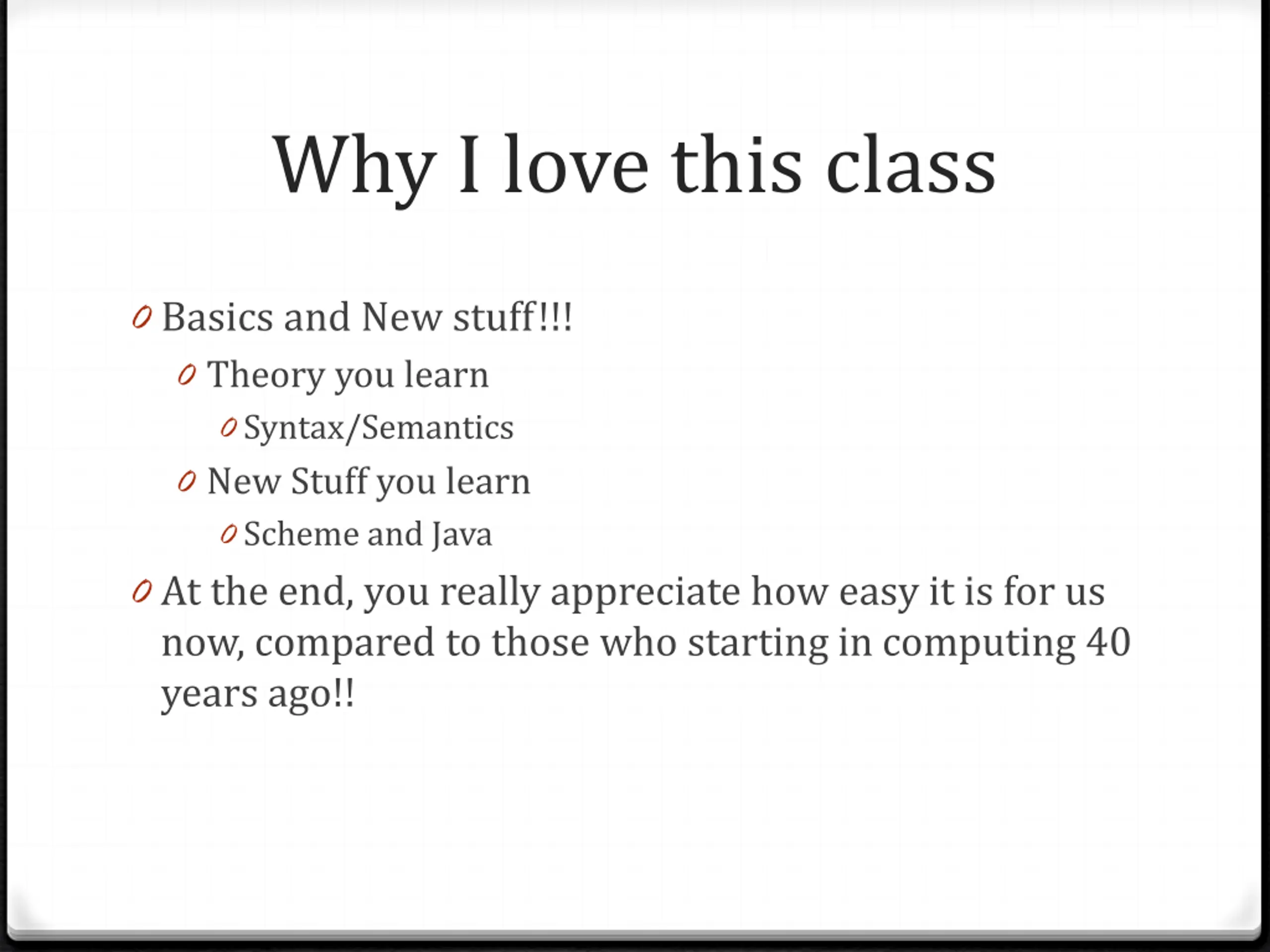 Why I love this class 0 Basics and New stuff!!! 0 Theory you learn 0 Syntax/Semantics 0 New Stuff you learn 0 Scheme and Java 0 At the end, you really appreciate how easy it is for us now, compared to those who starting in computing 40 years ago!!