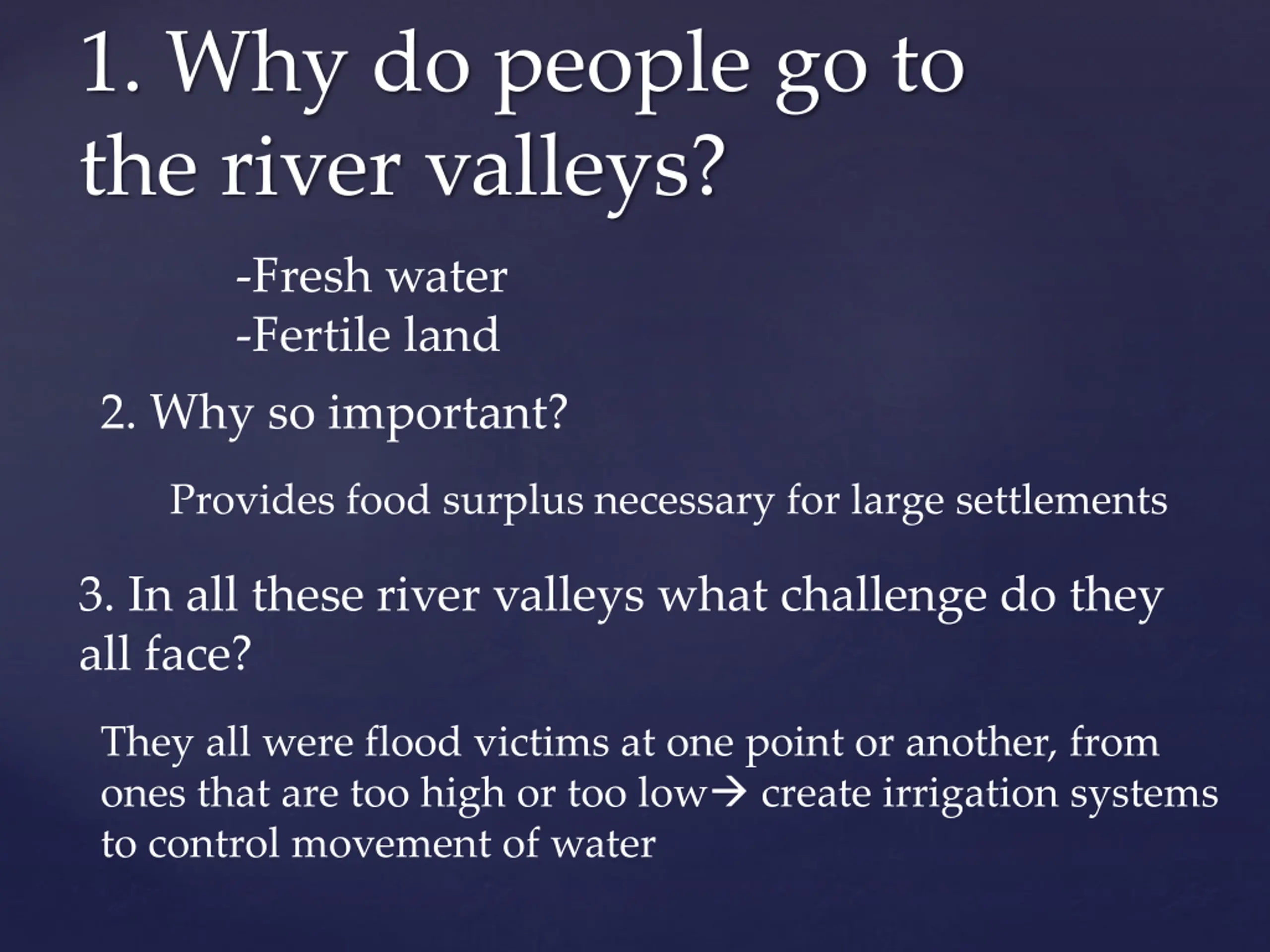 1. Why do people go to the river valleys? -Fresh water -Fertile land 2. Why so important? Provides food surplus necessary for large settlements 3. In all these river valleys what challenge do they all face? They all were flood victims at one point or another, from ones that are too high or too low create irrigation systems to control movement of water