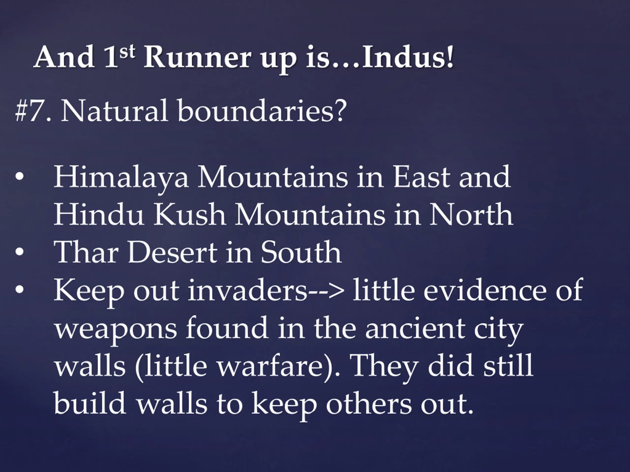 And 1stRunner up isIndus! #7. Natural boundaries? Himalaya Mountains in East and Hindu Kush Mountains in North Thar Desert in South Keep out invaders--> little evidence of weapons found in the ancient city walls (little warfare). They did still build walls to keep others out.