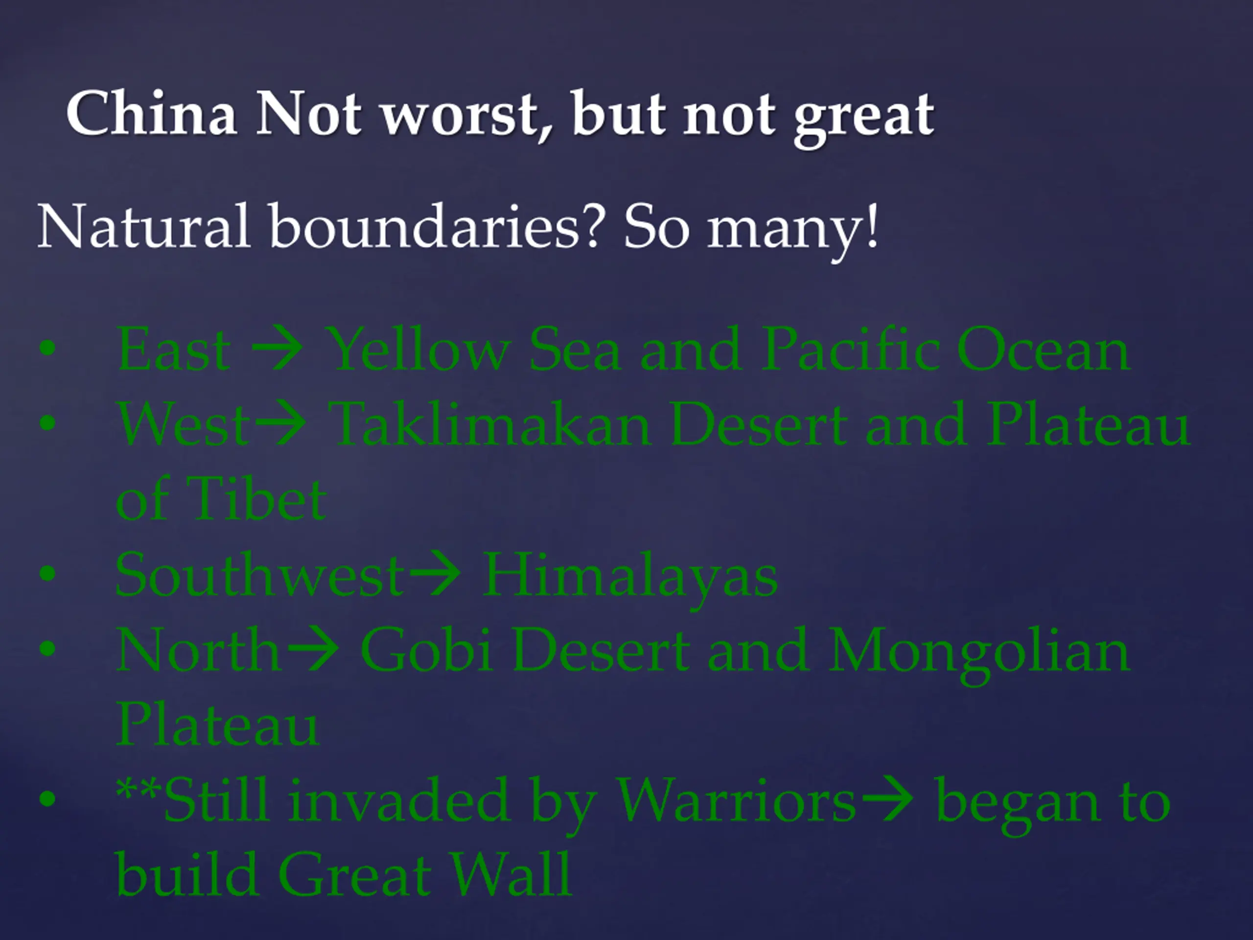 China Not worst, but not great Natural boundaries? So many! East Yellow Sea and Pacific Ocean West Taklimakan Desert and Plateau of Tibet Southwest Himalayas North Gobi Desert and Mongolian Plateau **Still invaded by Warriors began to build Great Wall
