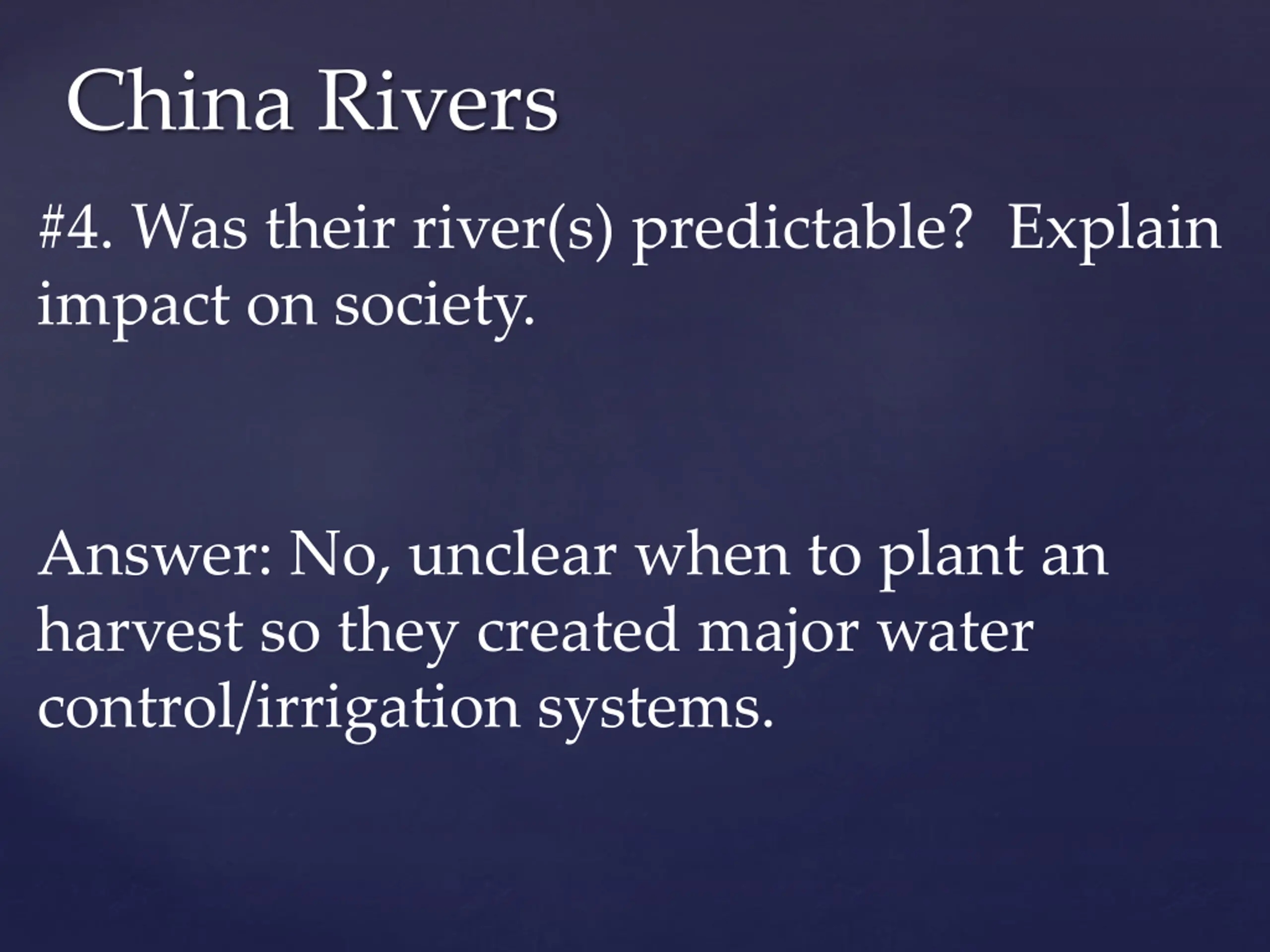China Rivers #4. Was their river(s) predictable? Explain impact on society. Answer: No, unclear when to plant an harvest so they created major water control/irrigation systems.