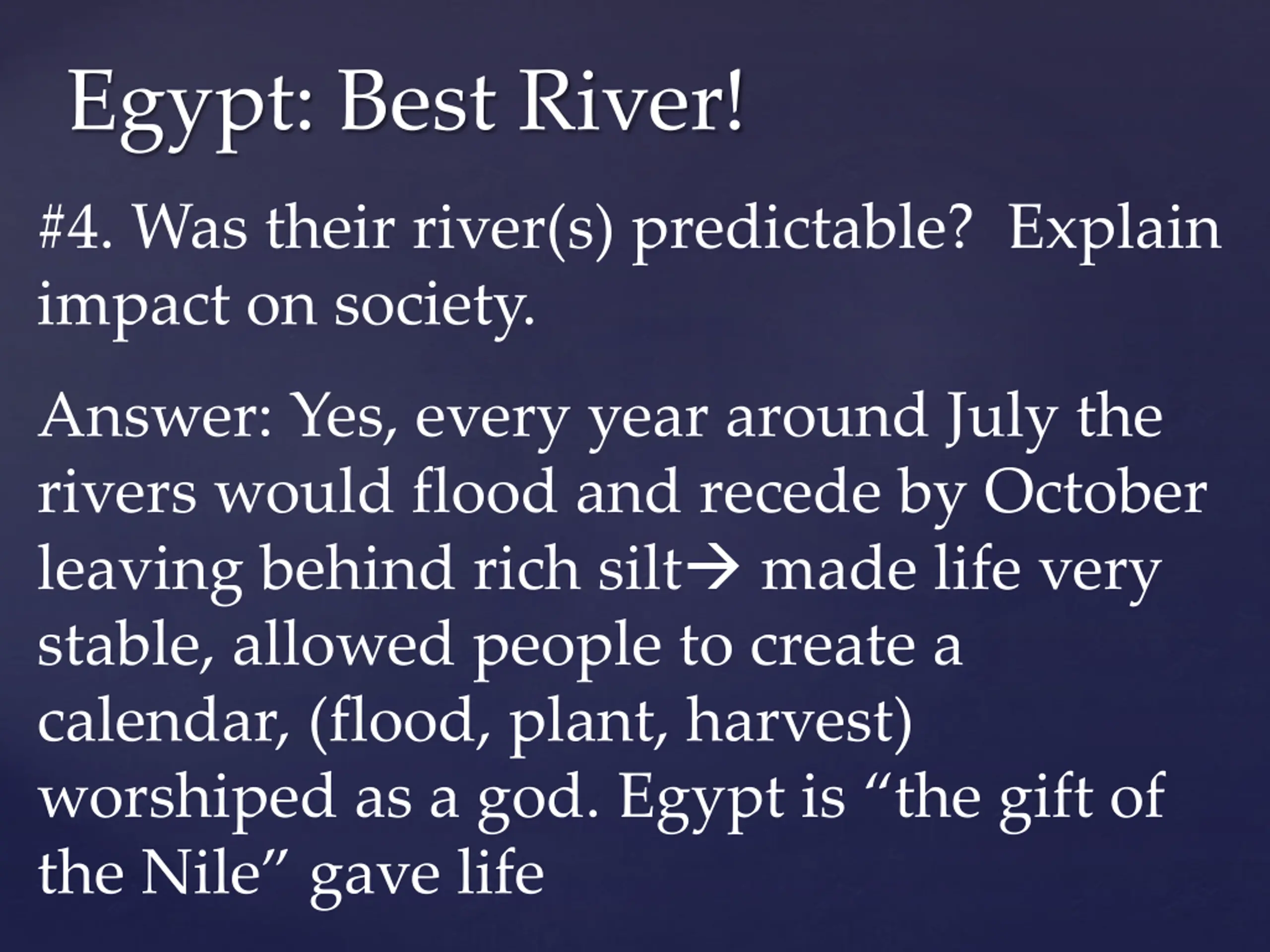 Egypt: Best River! #4. Was their river(s) predictable? Explain impact on society. Answer: Yes, every year around July the rivers would flood and recede by October leaving behind rich silt made life very stable, allowed people to create a calendar, (flood, plant, harvest) worshiped as a god. Egypt is the gift of the Nile gave life