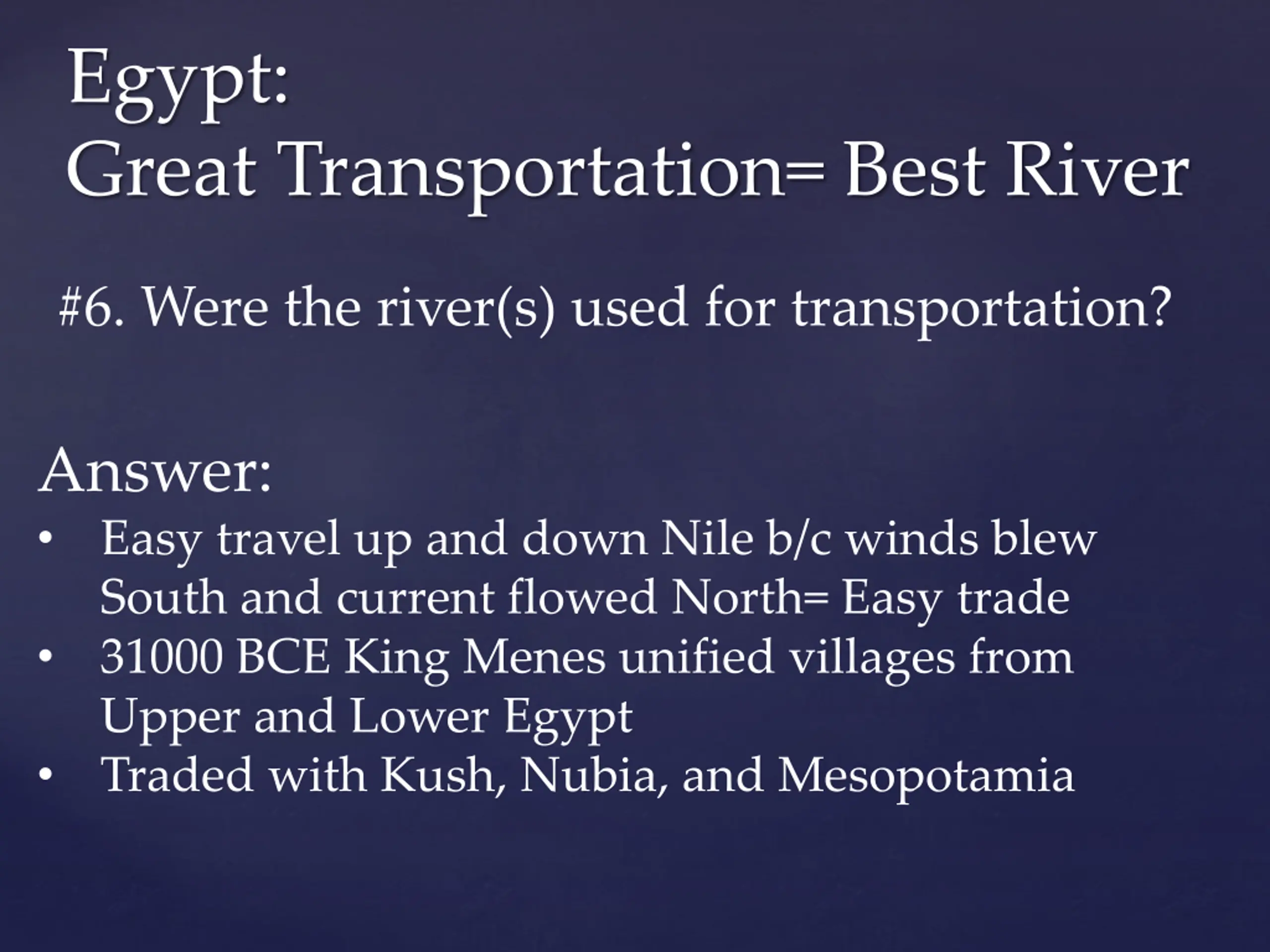 Egypt: Great Transportation= Best River #6. Were the river(s) used for transportation? Answer: Easy travel up and down Nile b/c winds blew South and current flowed North= Easy trade 31000 BCE King Menes unified villages from Upper and Lower Egypt Traded with Kush, Nubia, and Mesopotamia