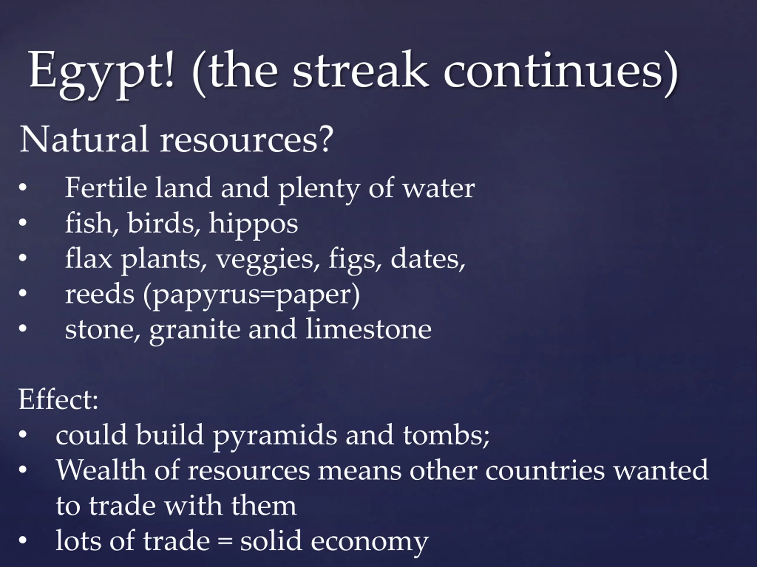Egypt! (the streak continues) Natural resources? Fertile land and plenty of water fish, birds, hippos flax plants, veggies, figs, dates, reeds (papyrus=paper) stone, granite and limestone Effect: could build pyramids and tombs; Wealth of resources means other countries wanted to trade with them lots of trade = solid economy