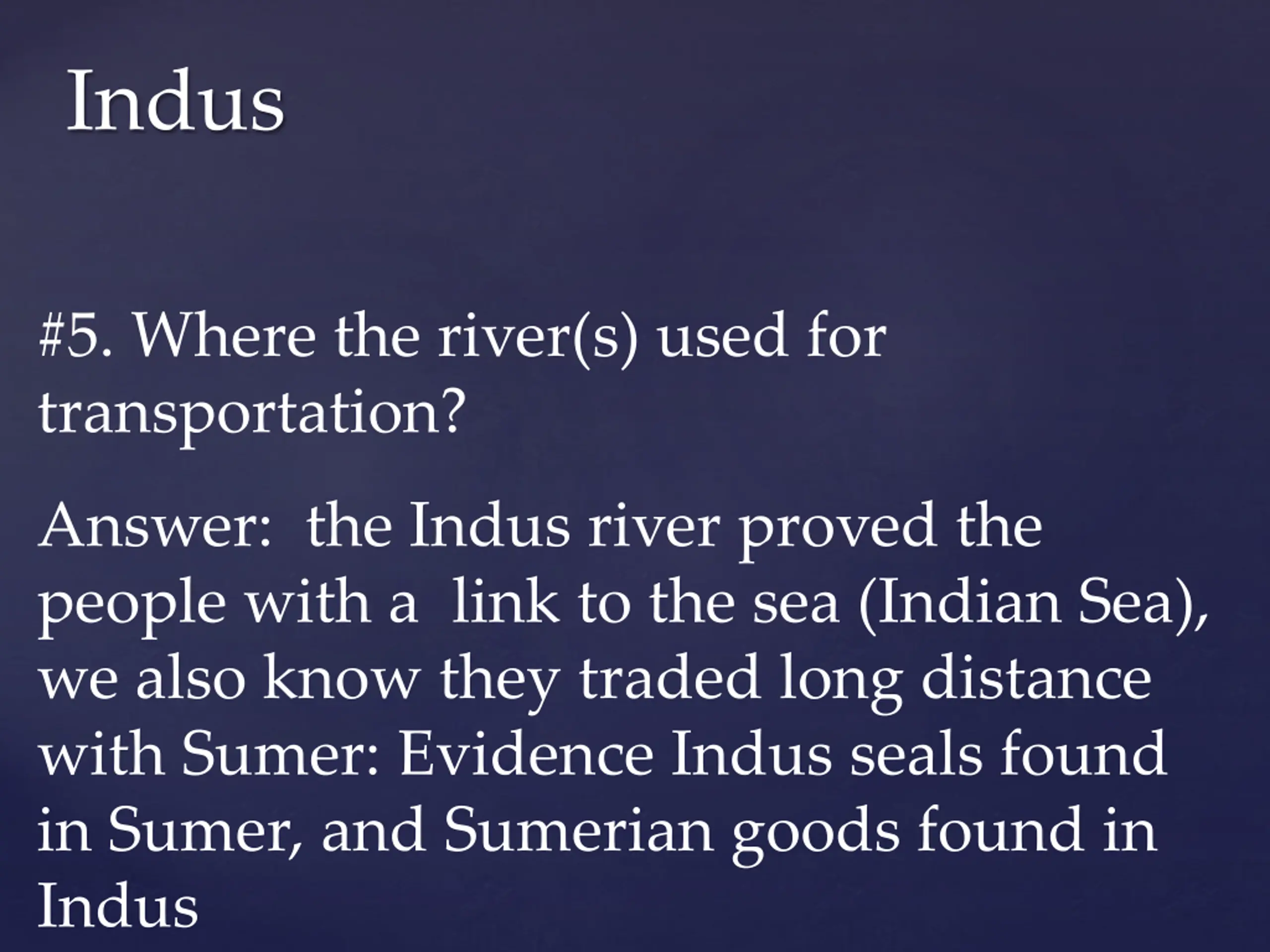 Indus #5. Where the river(s) used for transportation? Answer: the Indus river proved the people with a link to the sea (Indian Sea), we also know they traded long distance with Sumer: Evidence Indus seals found in Sumer, and Sumerian goods found in Indus