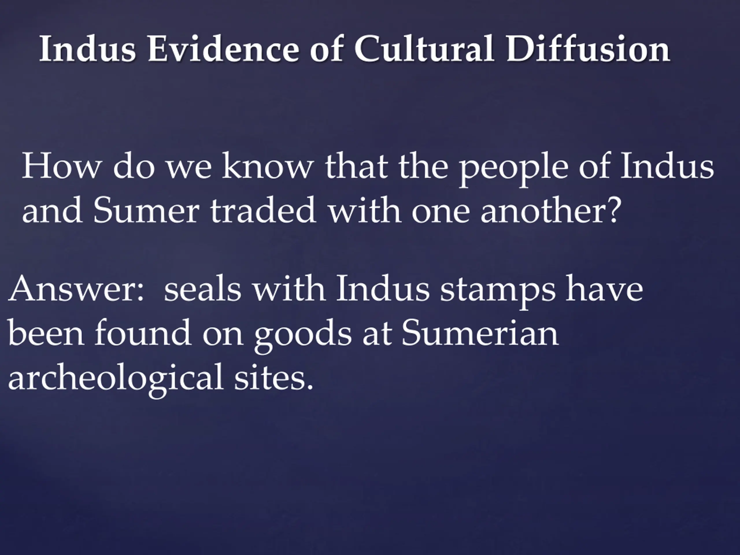 Indus Evidence of Cultural Diffusion How do we know that the people of Indus and Sumer traded with one another? Answer: seals with Indus stamps have been found on goods at Sumerian archeological sites.
