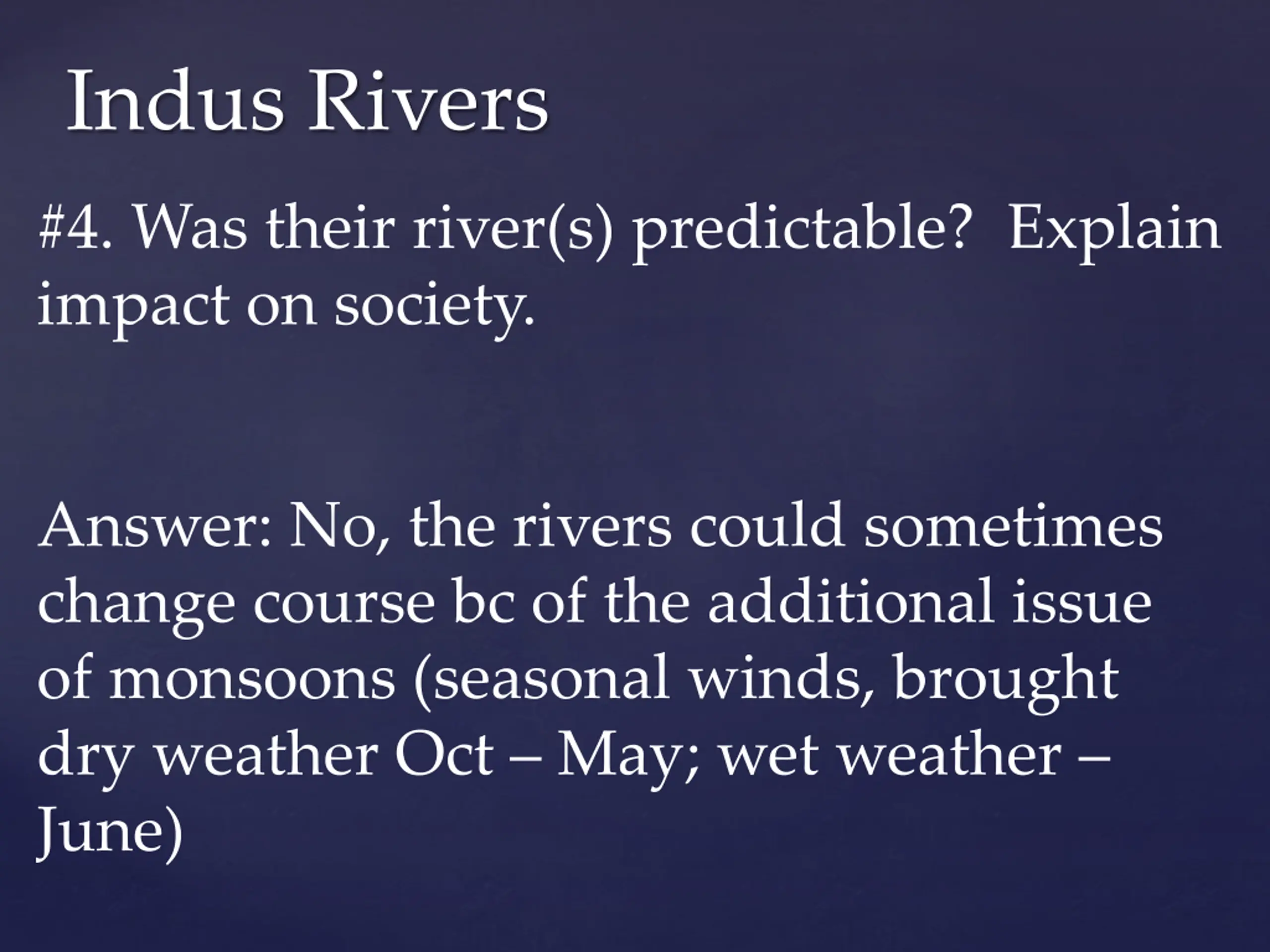 Indus Rivers #4. Was their river(s) predictable? Explain impact on society. Answer: No, the rivers could sometimes change course bc of the additional issue of monsoons (seasonal winds, brought dry weather Oct May; wet weather June)