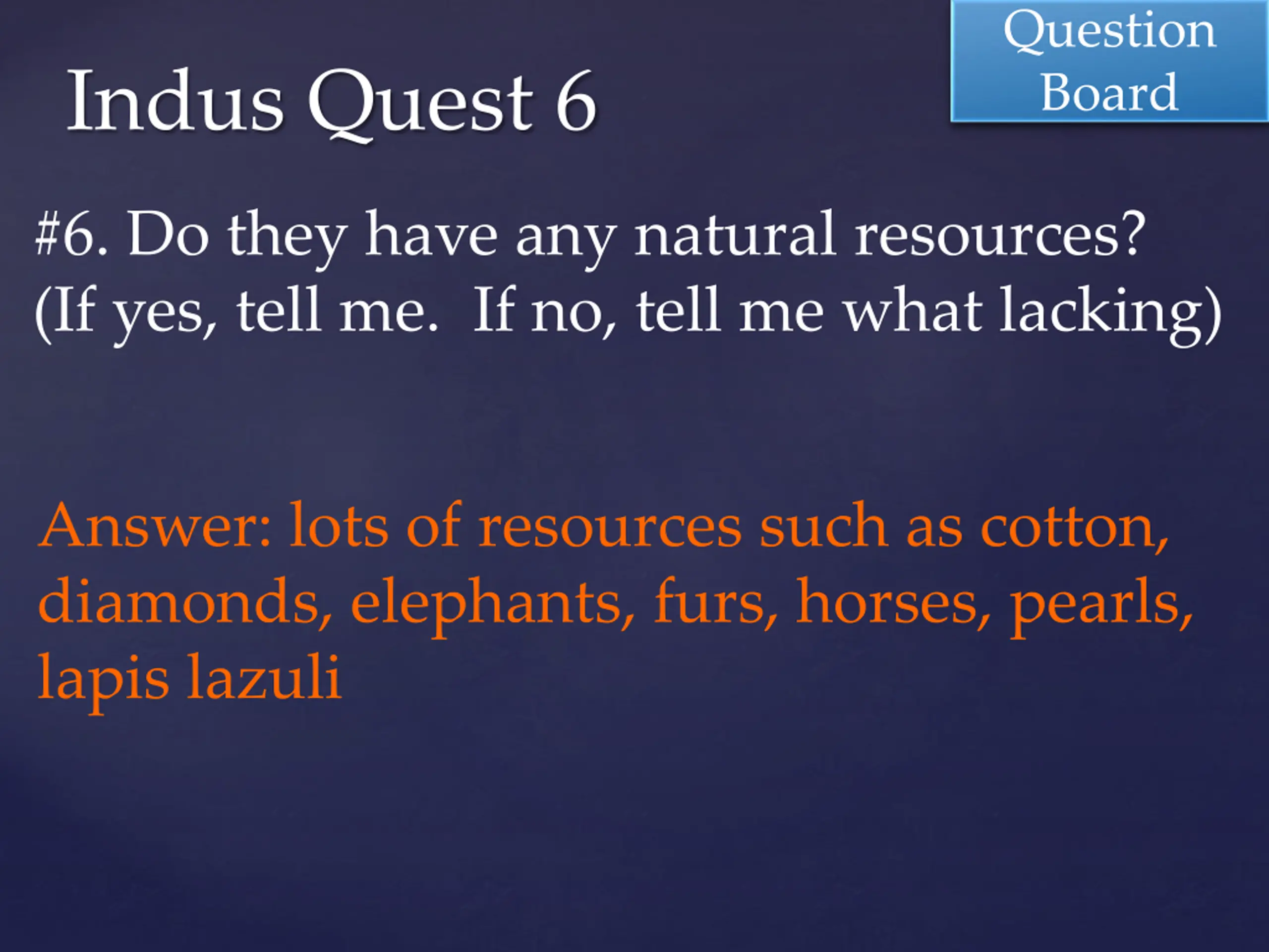 Question Board Indus Quest 6 #6. Do they have any natural resources? (If yes, tell me. If no, tell me what lacking) Answer: lots of resources such as cotton, diamonds, elephants, furs, horses, pearls, lapis lazuli