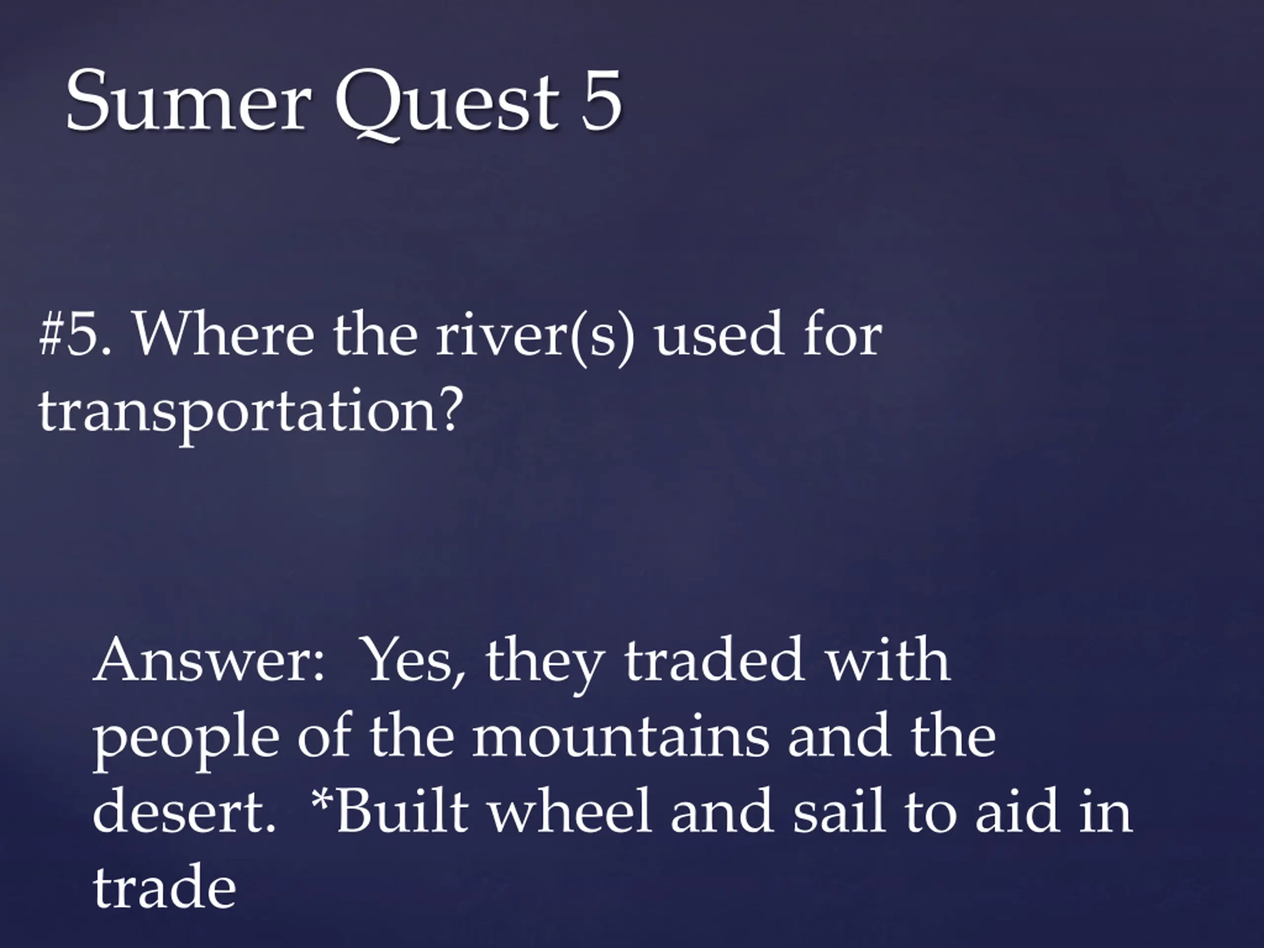Sumer Quest 5 #5. Where the river(s) used for transportation? Answer: Yes, they traded with people of the mountains and the desert. *Built wheel and sail to aid in trade