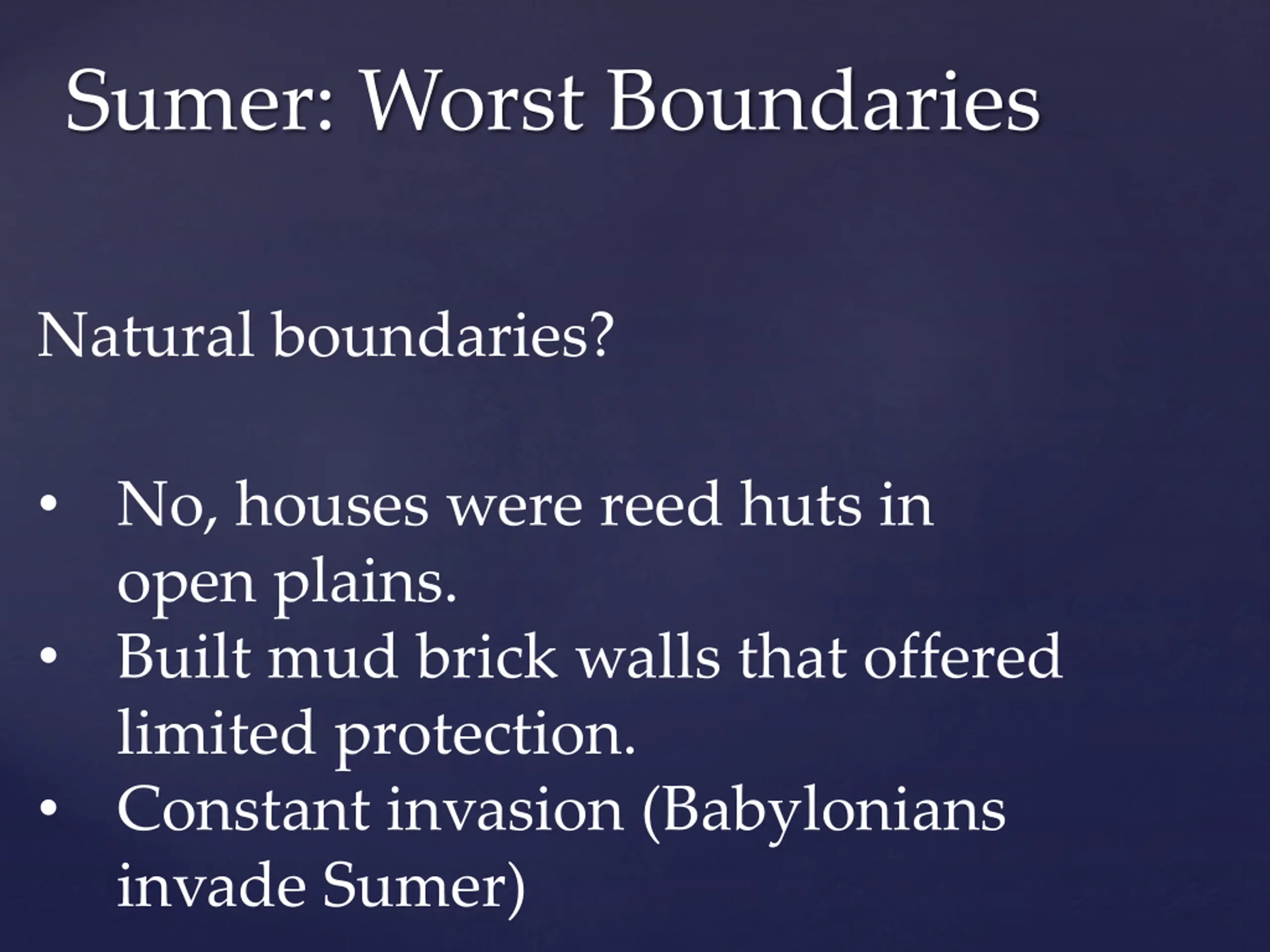 Sumer: Worst Boundaries Natural boundaries? No, houses were reed huts in open plains. Built mud brick walls that offered limited protection. Constant invasion (Babylonians invade Sumer)