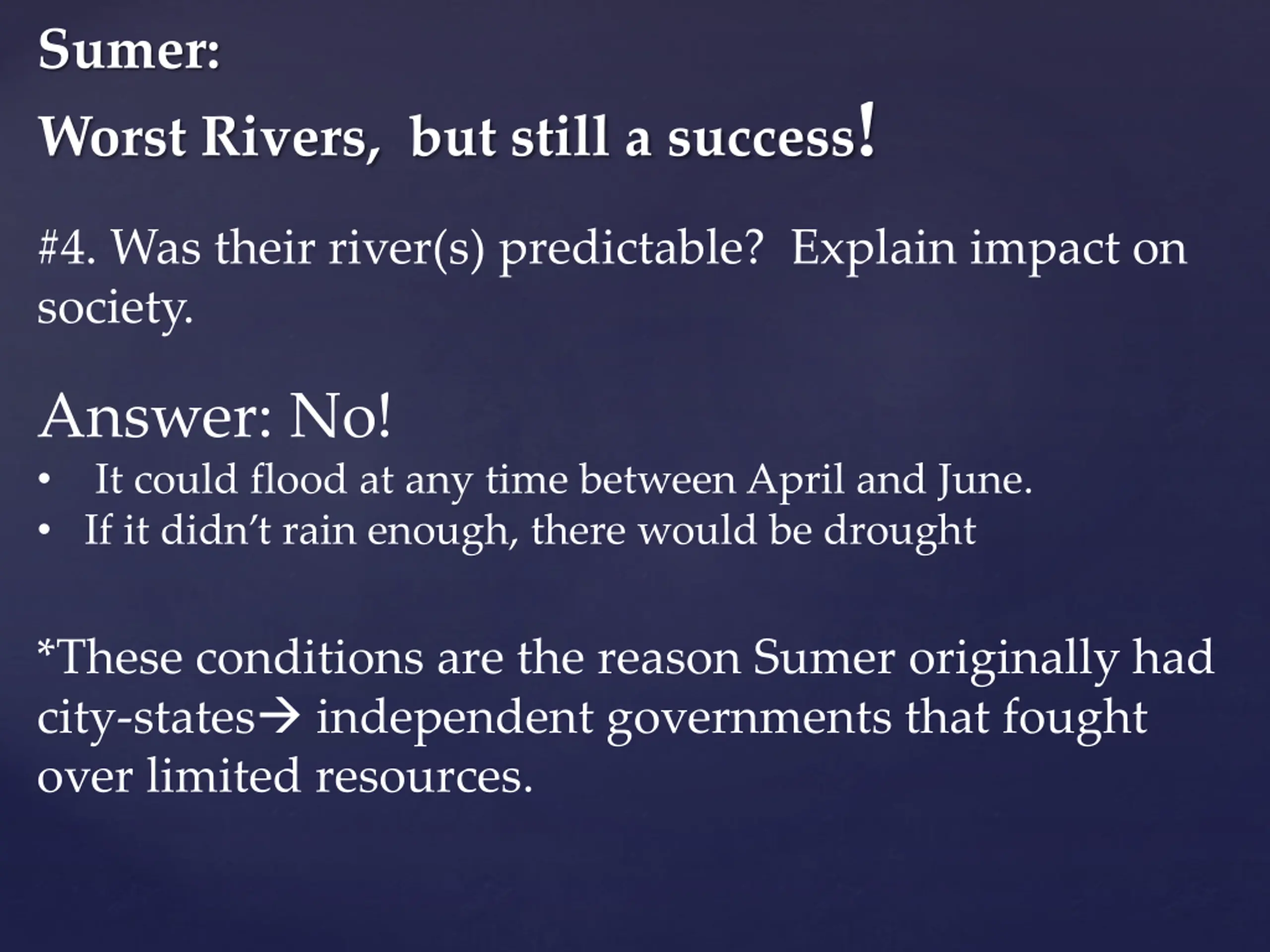 Sumer: Worst Rivers, but still a success! #4. Was their river(s) predictable? Explain impact on society. Answer: No! It could flood at any time between April and June. If it didn t rain enough, there would be drought *These conditions are the reason Sumer originally had city-states independent governments that fought over limited resources.