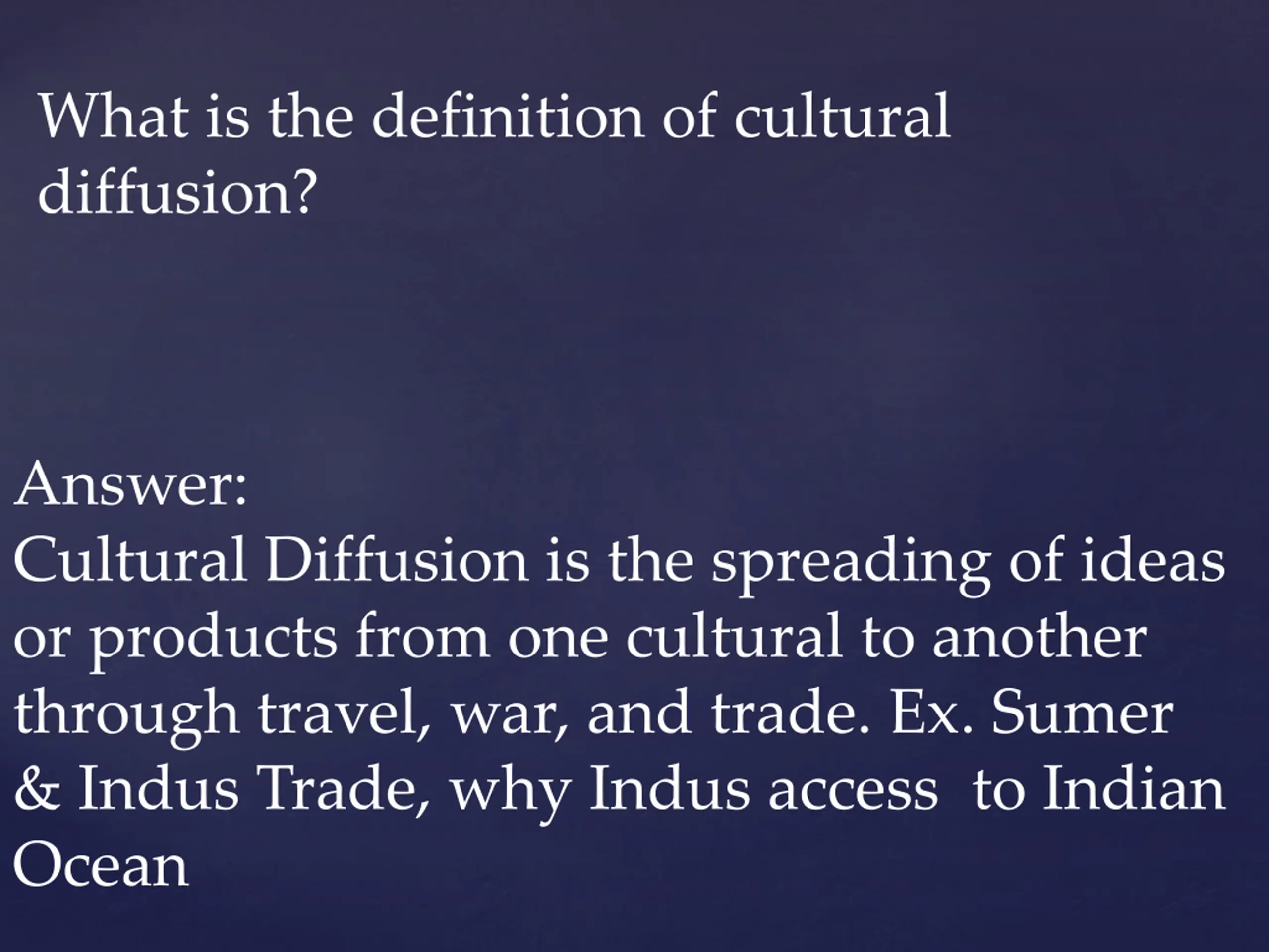 What is the definition of cultural diffusion? Answer: Cultural Diffusion is the spreading of ideas or products from one cultural to another through travel, war, and trade. Ex. Sumer & Indus Trade, why Indus access to Indian Ocean