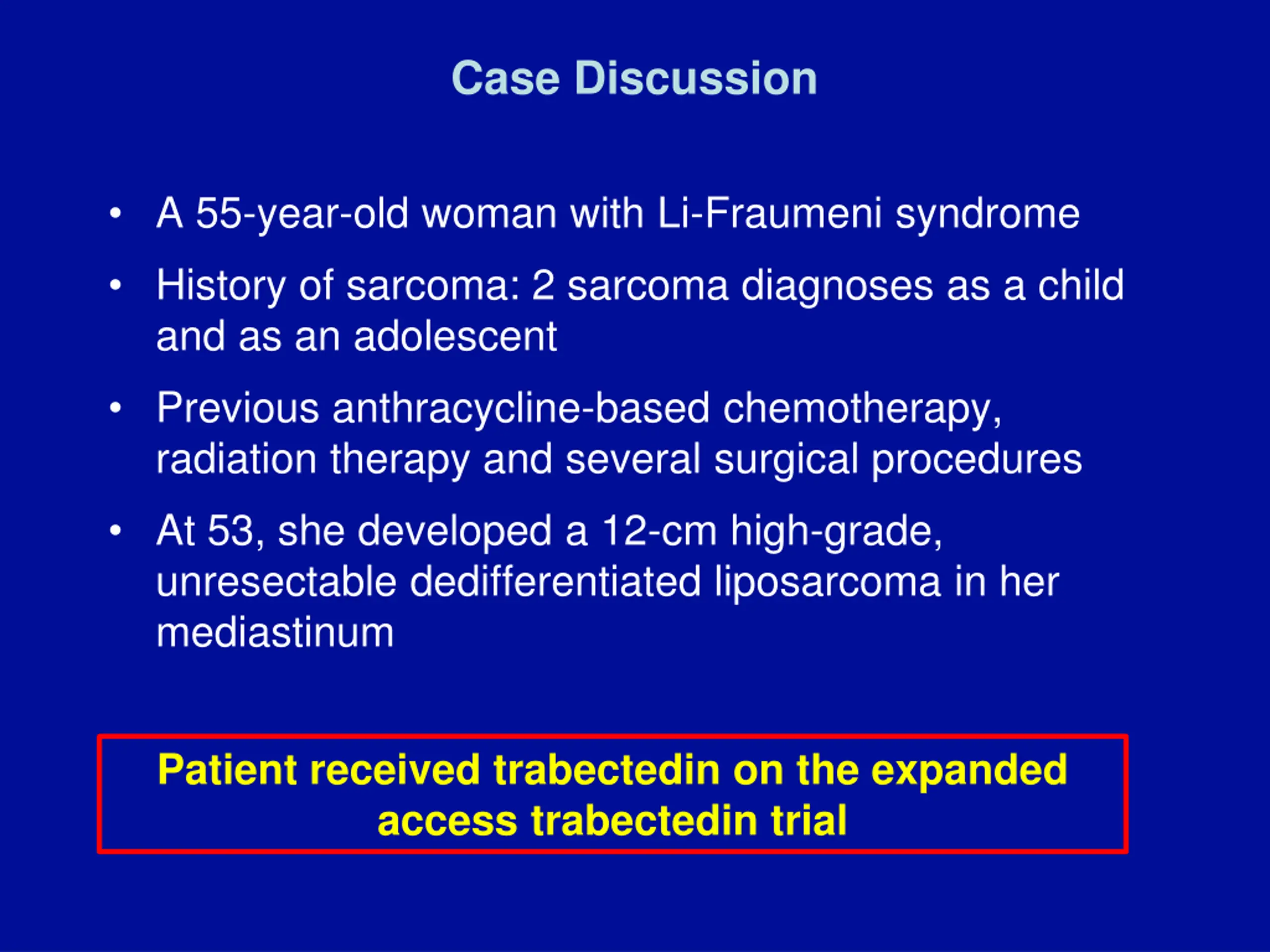Case Discussion A 55-year-old woman with Li-Fraumeni syndrome History of sarcoma: 2 sarcoma diagnoses as a child and as an adolescent Previous anthracycline-based chemotherapy, radiation therapy and several surgical procedures At 53, she developed a 12-cm high-grade, unresectable dedifferentiated liposarcoma in her mediastinum Patient received trabectedin on the expanded access trabectedin trial