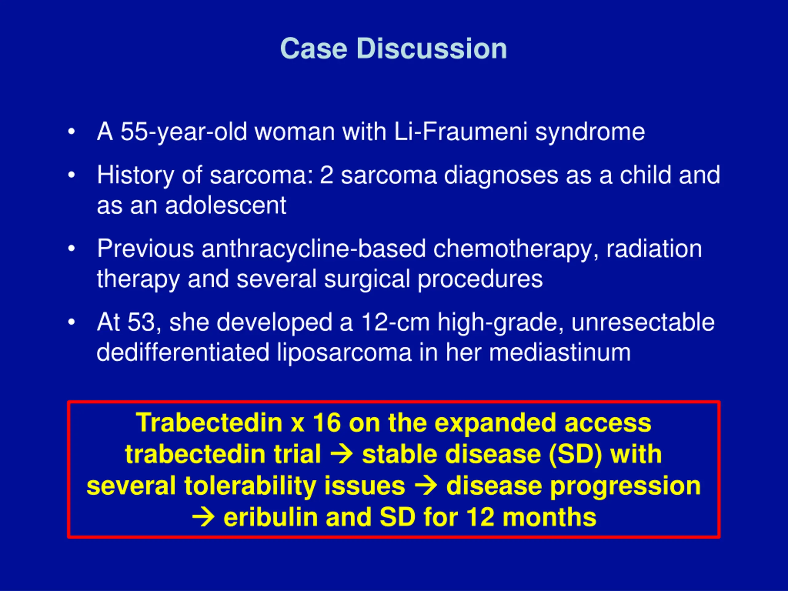 Case Discussion A 55-year-old woman with Li-Fraumeni syndrome History of sarcoma: 2 sarcoma diagnoses as a child and as an adolescent Previous anthracycline-based chemotherapy, radiation therapy and several surgical procedures At 53, she developed a 12-cm high-grade, unresectable dedifferentiated liposarcoma in her mediastinum Trabectedin x 16 on the expanded access trabectedin trial stable disease (SD) with several tolerability issues eribulin and SD for 12 months disease progression
