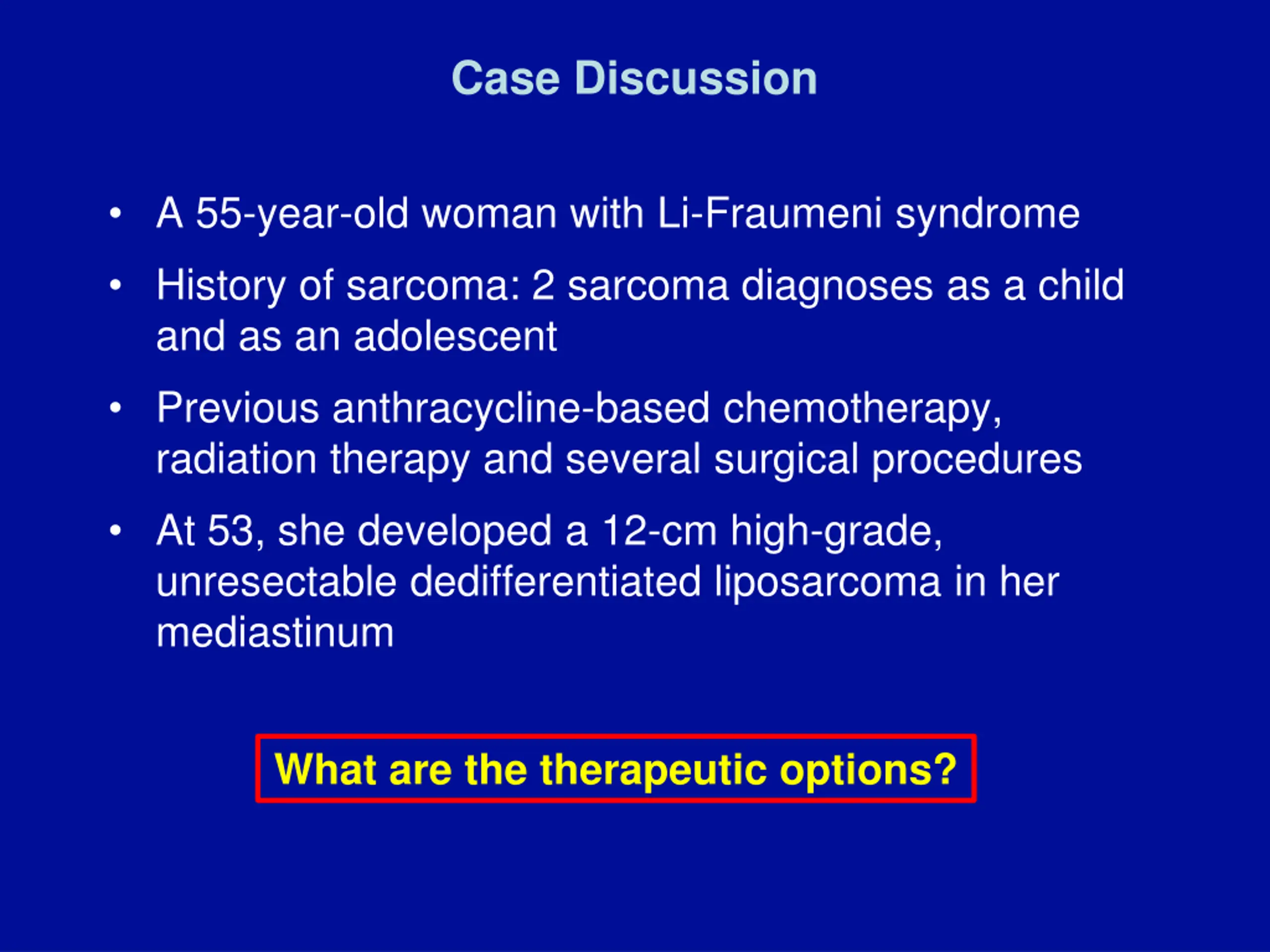 Case Discussion A 55-year-old woman with Li-Fraumeni syndrome History of sarcoma: 2 sarcoma diagnoses as a child and as an adolescent Previous anthracycline-based chemotherapy, radiation therapy and several surgical procedures At 53, she developed a 12-cm high-grade, unresectable dedifferentiated liposarcoma in her mediastinum What are the therapeutic options?