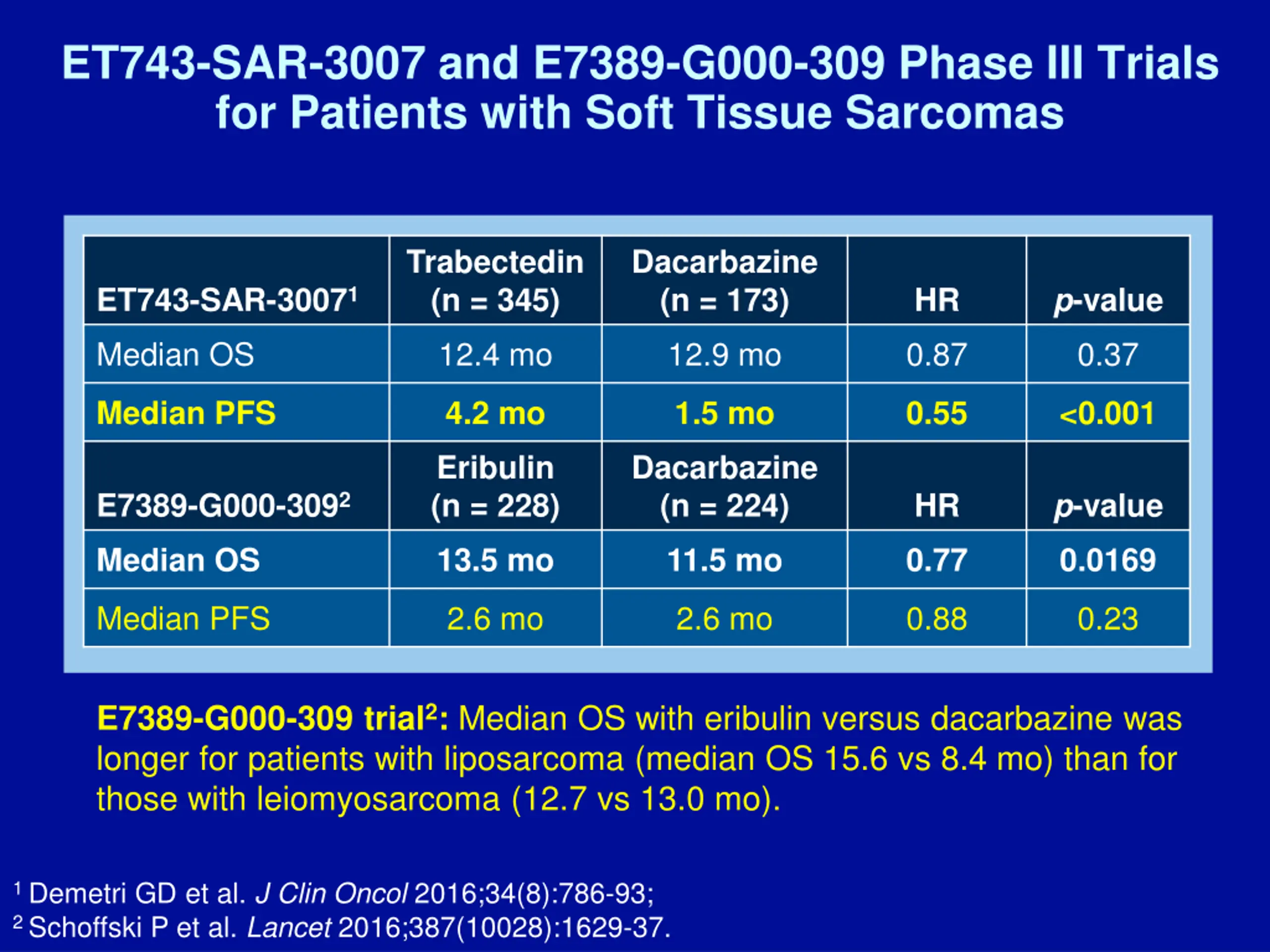 ET743-SAR-3007 and E7389-G000-309 Phase III Trials for Patients with Soft Tissue Sarcomas Trabectedin (n = 345) Dacarbazine (n = 173) p-value ET743-SAR-30071 HR Median OS 12.4 mo 12.9 mo 0.87 0.37 Median PFS 4.2 mo 1.5 mo 0.55 <0.001 Eribulin (n = 228) Dacarbazine (n = 224) p-value E7389-G000-3092 HR Median OS 13.5 mo 11.5 mo 0.77 0.0169 Median PFS 2.6 mo 2.6 mo 0.88 0.23 E7389-G000-309 trial2: Median OS with eribulin versus dacarbazine was longer for patients with liposarcoma (median OS 15.6 vs 8.4 mo) than for those with leiomyosarcoma (12.7 vs 13.0 mo). 1 Demetri GD et al. J Clin Oncol 2016;34(8):786-93; 2 Schoffski P et al. Lancet 2016;387(10028):1629-37.