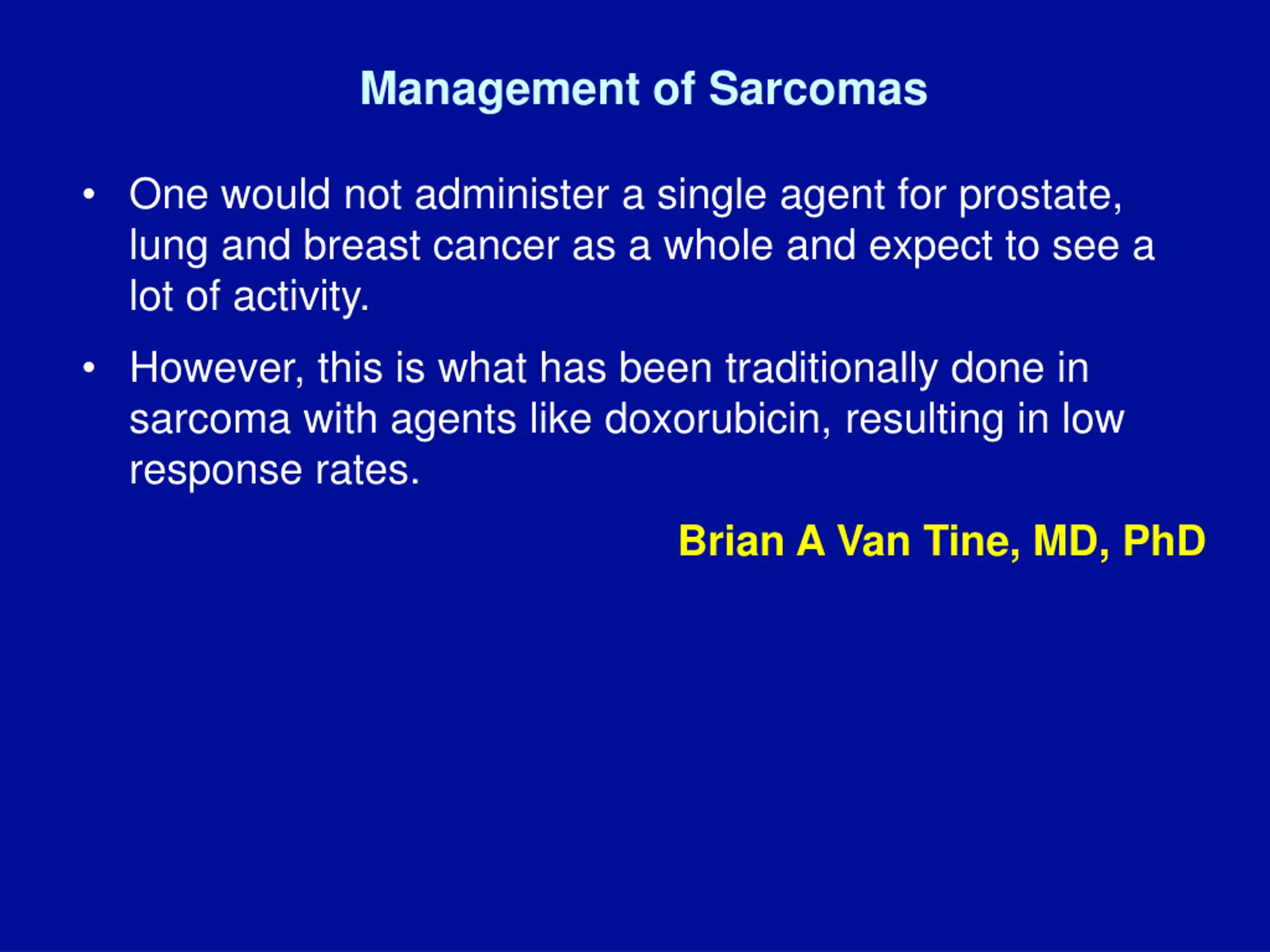 Management of Sarcomas One would not administer a single agent for prostate, lung and breast cancer as a whole and expect to see a lot of activity. However, this is what has been traditionally done in sarcoma with agents like doxorubicin, resulting in low response rates. Brian A Van Tine, MD, PhD