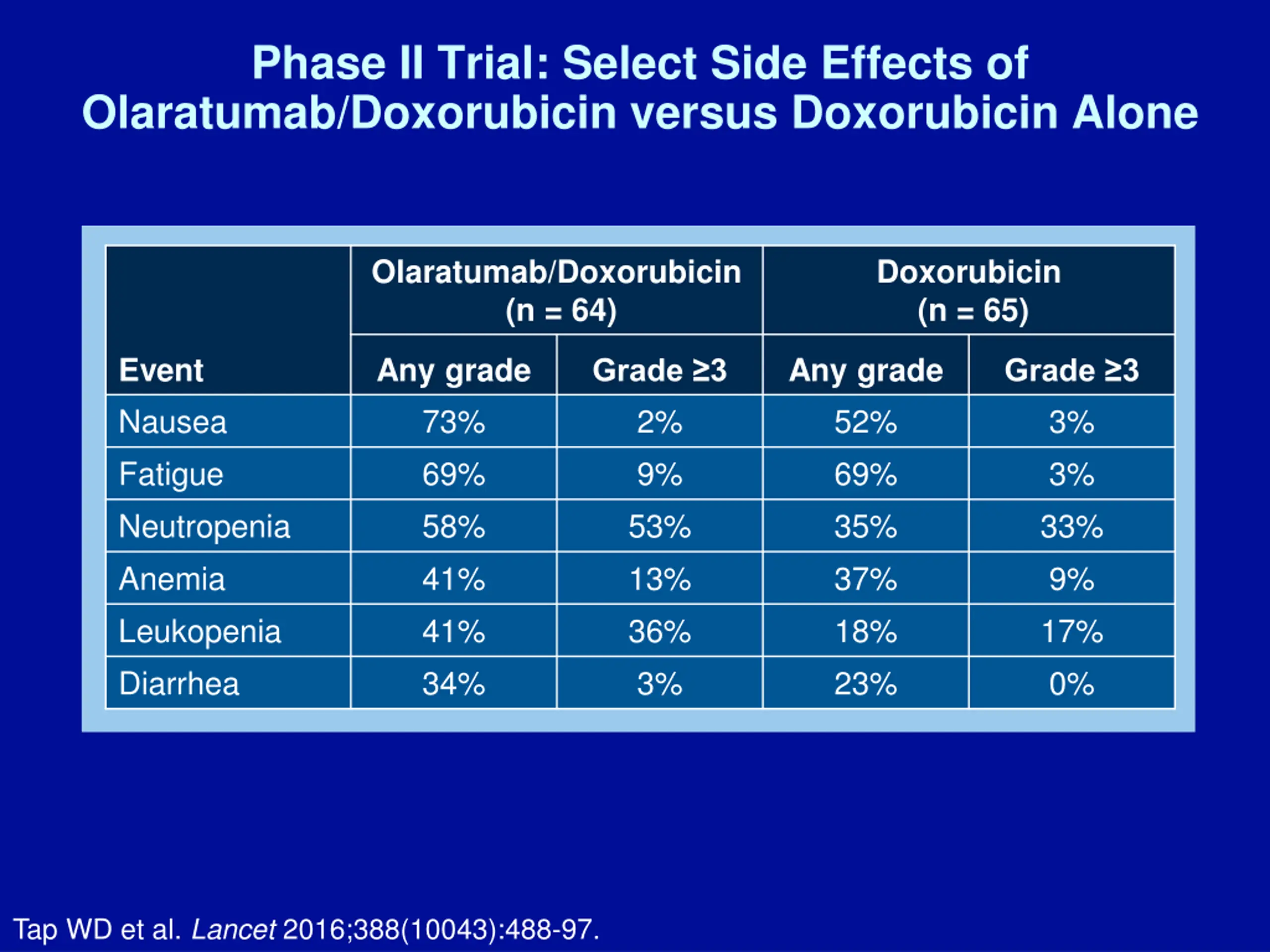 Phase II Trial: Select Side Effects of Olaratumab/Doxorubicin versus Doxorubicin Alone Olaratumab/doxorubicin (n = 64) Doxorubicin (n = 65) Event Nausea Any grade 73% Any grade 52% Grade 3 Grade 3 2% 3% Neutropenia 58% 53% 35% 33% Mucositis 53% 3% 35% 5% Vomiting 45% 0% 18% 0% Diarrhea 34% 3% 23% 0% Febrile neutropenia 13% 13% 14% 14% Tap WD et al. Lancet 2016;388(10043):488-97.