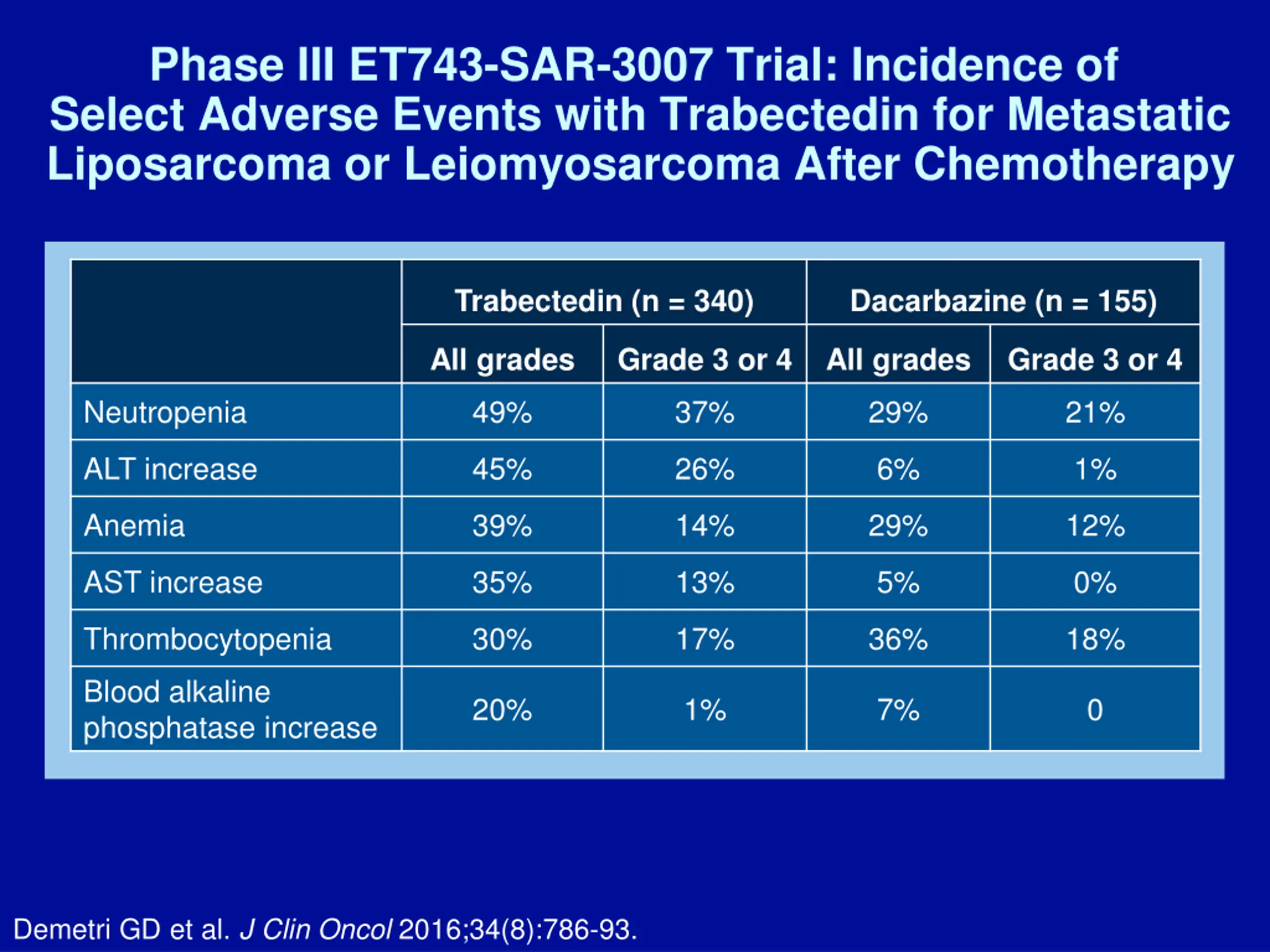 Phase III ET743-SAR-3007 Trial: Incidence of Select Adverse Events with Trabectedin for Metastatic Liposarcoma or Leiomyosarcoma After Chemotherapy Trabectedin (n = 340) Dacarbazine (n = 155) All grades Grade 3 or 4 All grades Grade 3 or 4 Neutropenia 49% 37% 29% 21% ALT increase 45% 26% 6% 1% Anemia 39% 14% 29% 12% AST increase 35% 13% 5% 0% Thrombocytopenia 30% 17% 36% 18% Blood alkaline phosphatase increase 20% 1% 7% 0 Demetri GD et al. J Clin Oncol 2016;34(8):786-93.