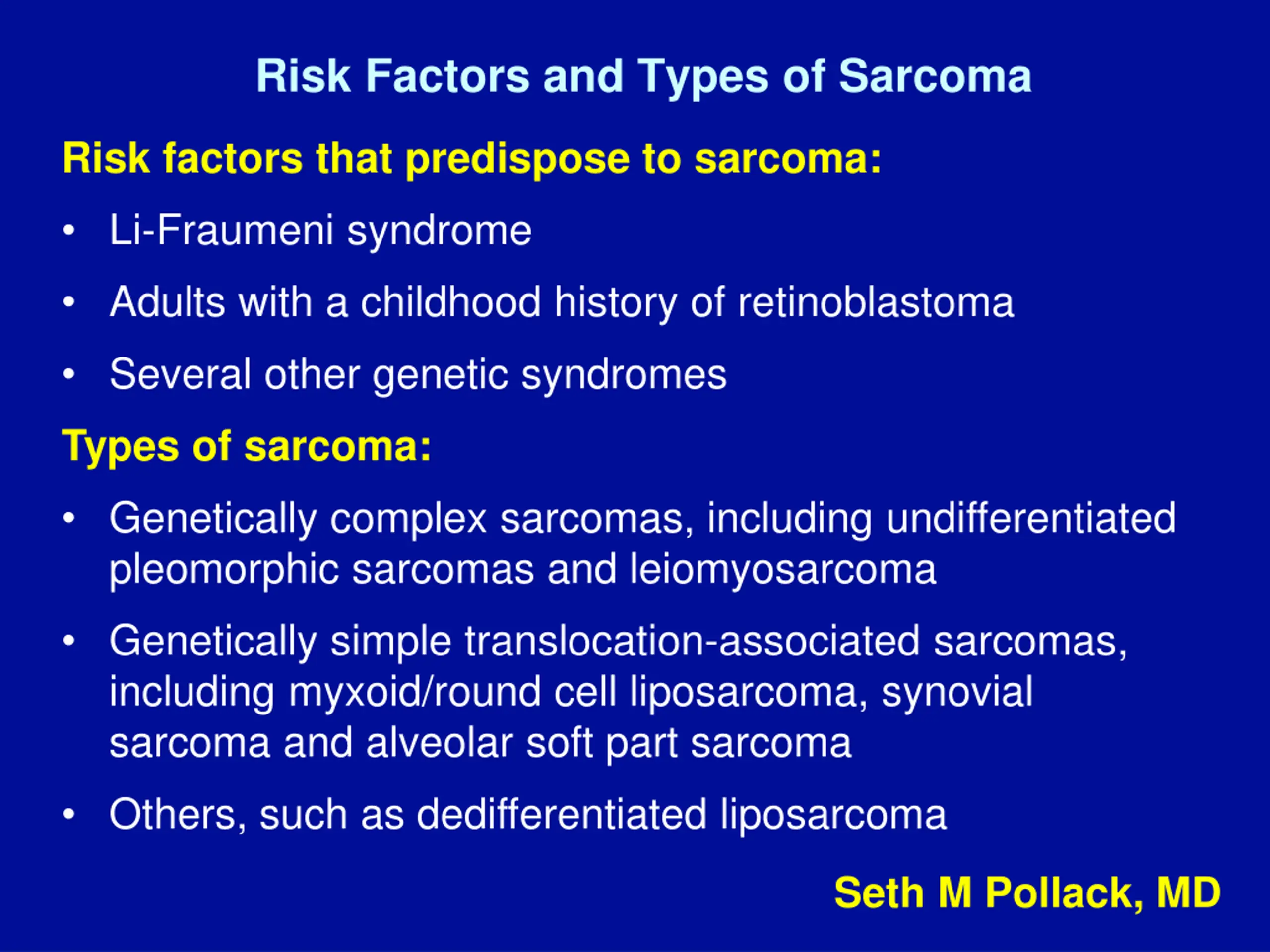 Risk Factors and Types of Sarcoma Risk factors that predispose to sarcoma: Li-Fraumeni syndrome Adults with a childhood history of retinoblastoma Several other genetic syndromes Types of sarcoma: Genetically complex sarcomas, including undifferentiated pleomorphic sarcomas and leiomyosarcoma Genetically simple translocation-associated sarcomas, including myxoid/round cell liposarcoma, synovial sarcoma and alveolar soft part sarcoma Others, such as dedifferentiated liposarcoma Seth M Pollack, MD