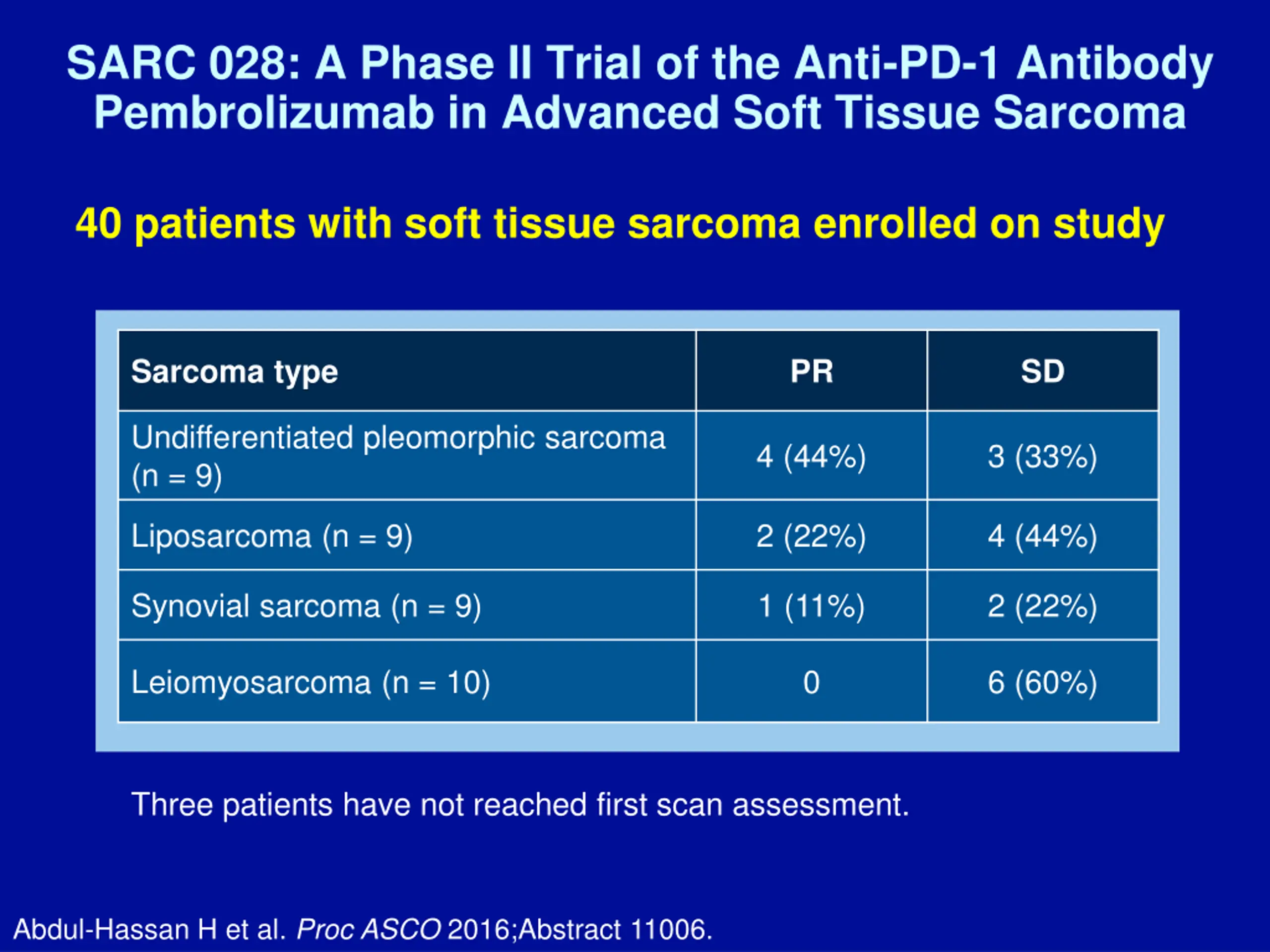 SARC 028: A Phase II Trial of the Anti-PD-1 Antibody Pembrolizumab in Advanced Soft Tissue Sarcoma 40 patients with soft tissue sarcoma enrolled on study Sarcoma type PR SD Undifferentiated pleomorphic sarcoma (n = 9) 4 (44%) 3 (33%) Liposarcoma (n = 9) 2 (22%) 4 (44%) Synovial sarcoma (n = 9) 1 (11%) 2 (22%) Leiomyosarcoma (n = 10) 0 6 (60%) Three patients have not reached first scan assessment. Abdul-Hassan H et al. Proc ASCO 2016;Abstract 11006.
