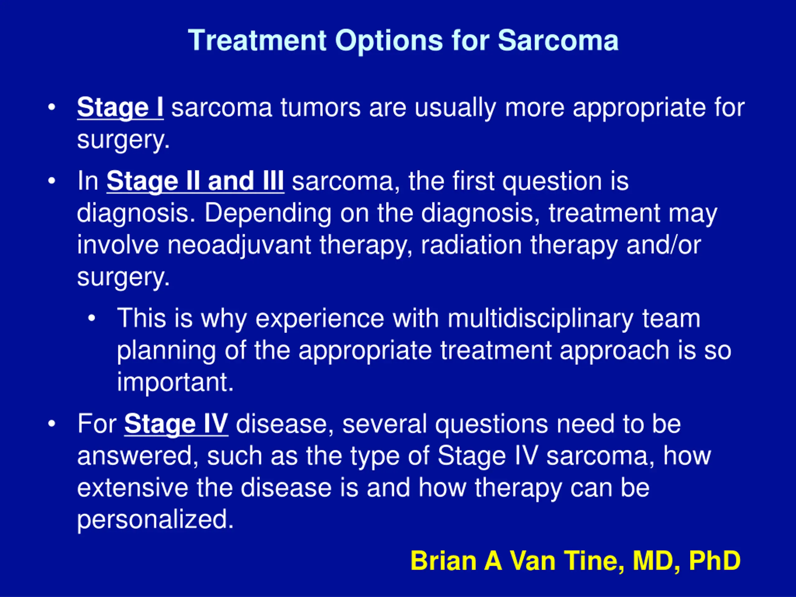 Treatment Options for Sarcoma Stage I sarcoma tumors are usually more appropriate for surgery. In Stage II and III sarcoma, the first question is diagnosis. Depending on the diagnosis, treatment may involve neoadjuvant therapy, radiation therapy and/or surgery. This is why experience with multidisciplinary team planning of the appropriate treatment approach is so important. For Stage IV disease, several questions need to be answered, such as the type of Stage IV sarcoma, how extensive the disease is and how therapy can be personalized. Brian A Van Tine, MD, PhD