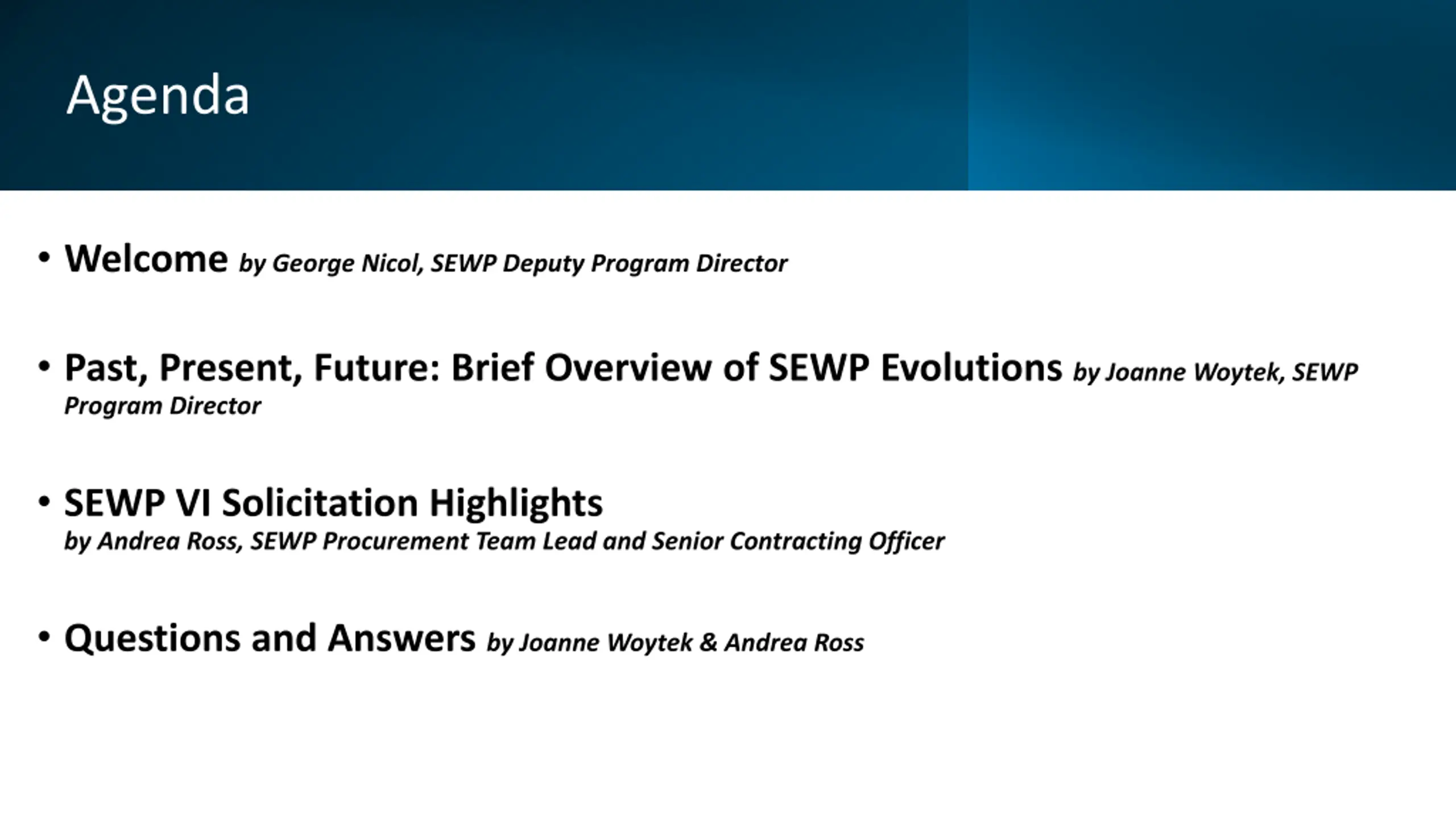 Agenda Welcome by George Nicol, SEWP Deputy Program Director Past, Present, Future: Brief Overview of SEWP Evolutions by Joanne Woytek, SEWP Program Director SEWP VI Solicitation Highlights by Andrea Ross, SEWP Procurement Team Lead and Senior Contracting Officer Questions and Answers by Joanne Woytek & Andrea Ross