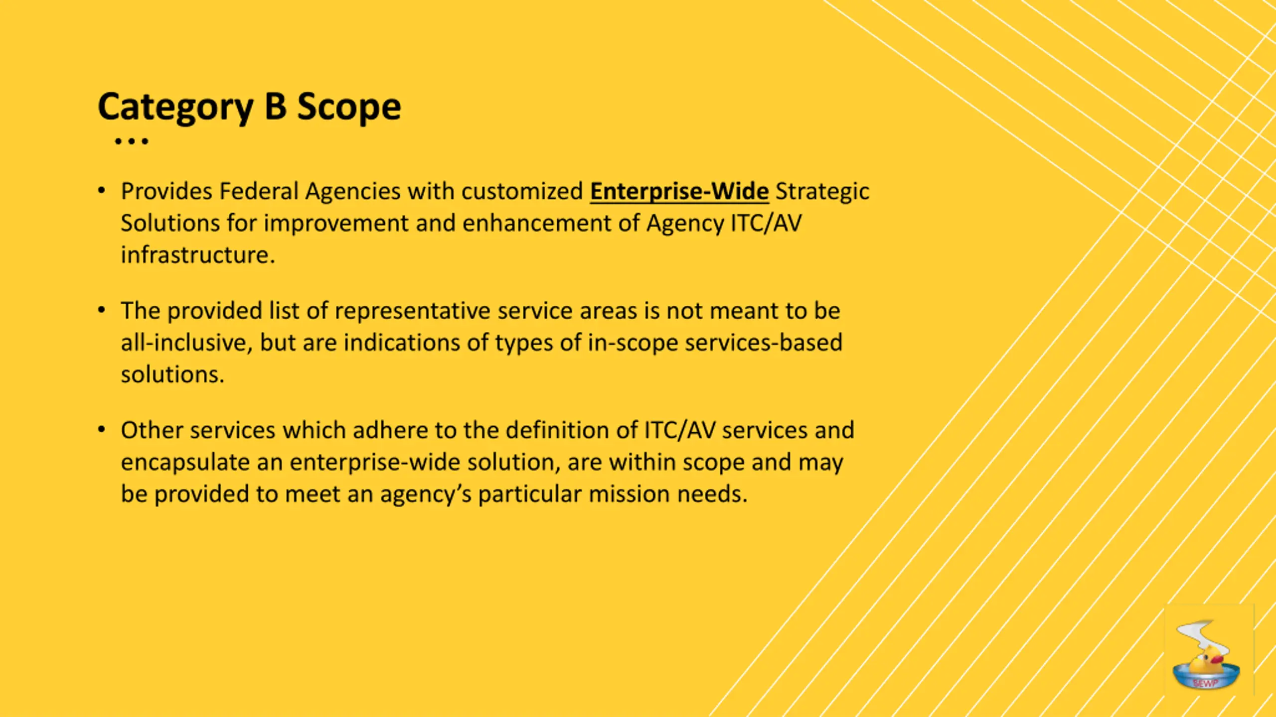 Category B Scope Provides Federal Agencies with customized Enterprise-Wide Strategic Solutions for improvement and enhancement of Agency ITC/AV infrastructure. The provided list of representative service areas is not meant to be all-inclusive, but are indications of types of in-scope services-based solutions. Other services which adhere to the definition of ITC/AV services and encapsulate an enterprise-wide solution, are within scope and may be provided to meet an agency s particular mission needs.