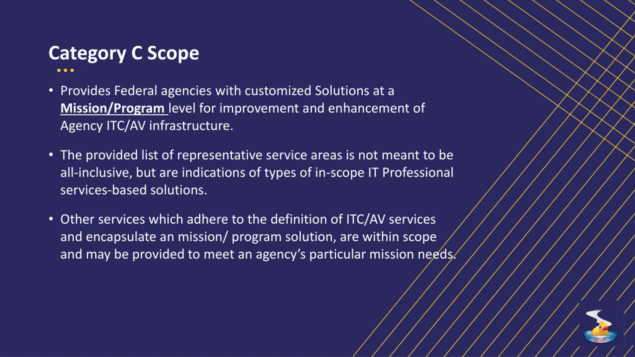 Category C Scope Provides Federal agencies with customized Solutions at a Mission/Program level for improvement and enhancement of Agency ITC/AV infrastructure. The provided list of representative service areas is not meant to be all-inclusive, but are indications of types of in-scope IT Professional services-based solutions. Other services which adhere to the definition of ITC/AV services and encapsulate an mission/ program solution, are within scope and may be provided to meet an agency s particular mission needs.