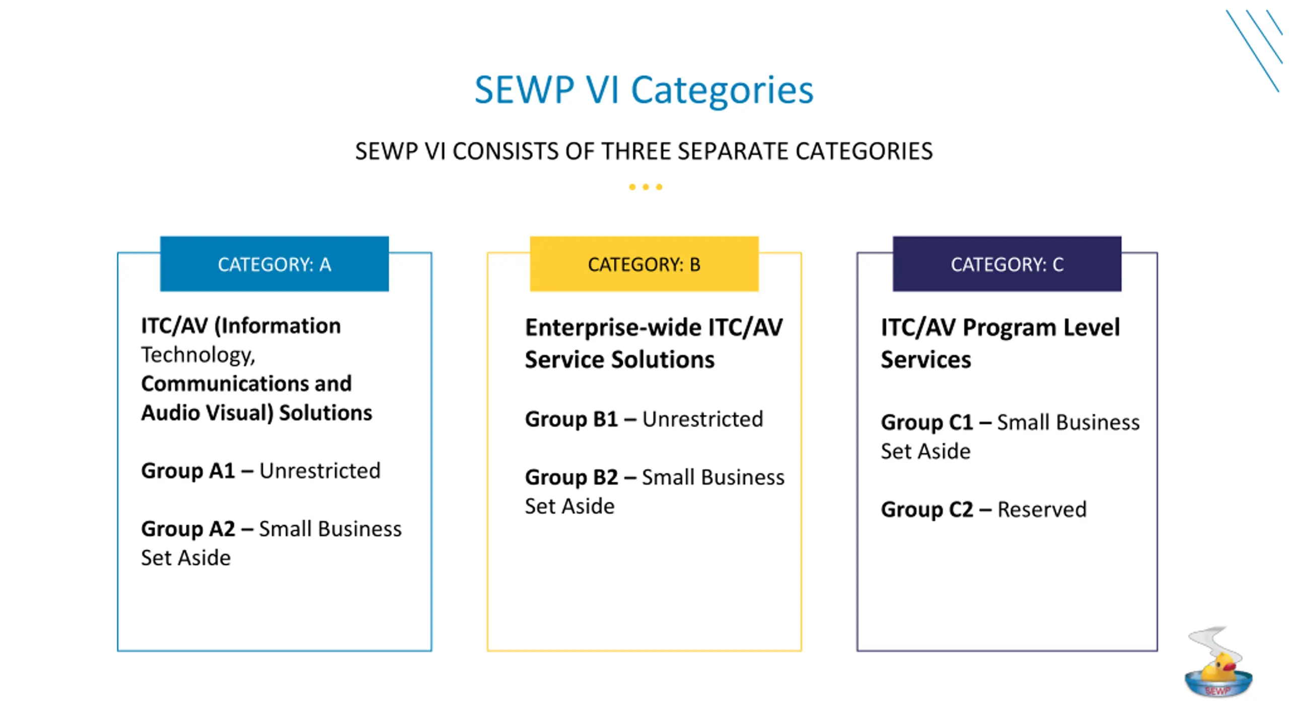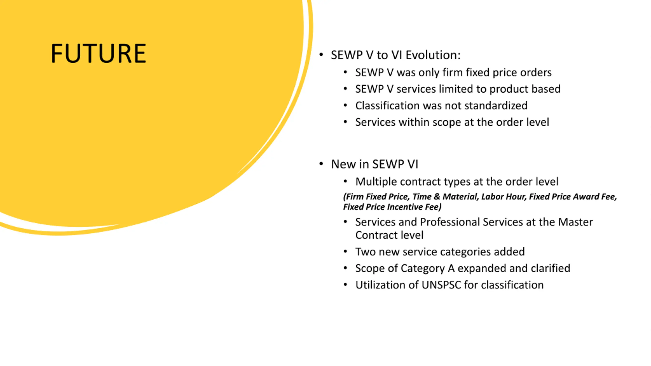 FUTURE SEWP V to VI Evolution: SEWP V was only firm fixed price orders SEWP V services limited to product based Classification was not standardized Services within scope at the order level New in SEWP VI Multiple contract types at the order level (Firm Fixed Price, Time & Material, Labor Hour, Fixed Price Award Fee, Fixed Price Incentive Fee) Services and Professional Services at the Master Contract level Two new service categories added Scope of Category A expanded and clarified Utilization of UNSPSC for classification