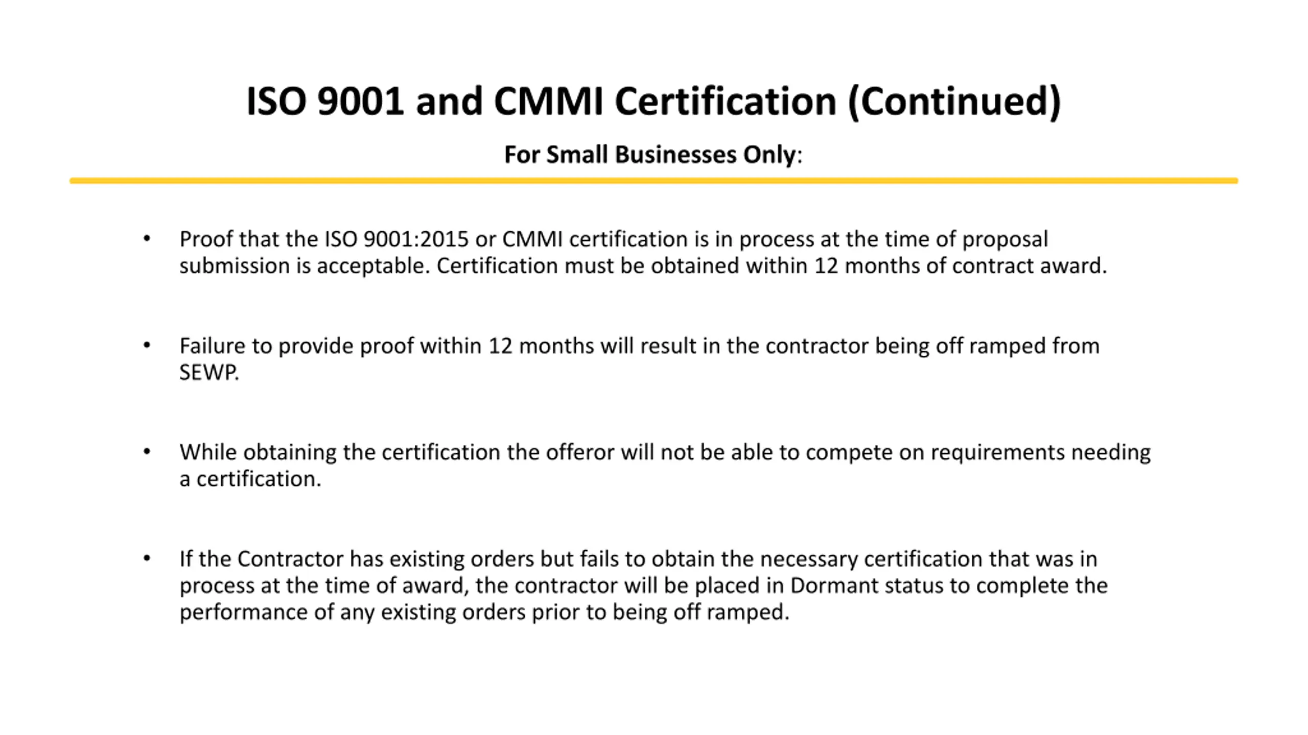 ISO 9001 and CMMI Certification (Continued) For Small Businesses Only: Proof that the ISO 9001:2015 or CMMI certification is in process at the time of proposal submission is acceptable. Certification must be obtained within 12 months of contract award. Failure to provide proof within 12 months will result in the contractor being off ramped from SEWP. While obtaining the certification the offeror will not be able to compete on requirements needing a certification. If the Contractor has existing orders but fails to obtain the necessary certification that was in process at the time of award, the contractor will be placed in Dormant status to complete the performance of any existing orders prior to being off ramped.