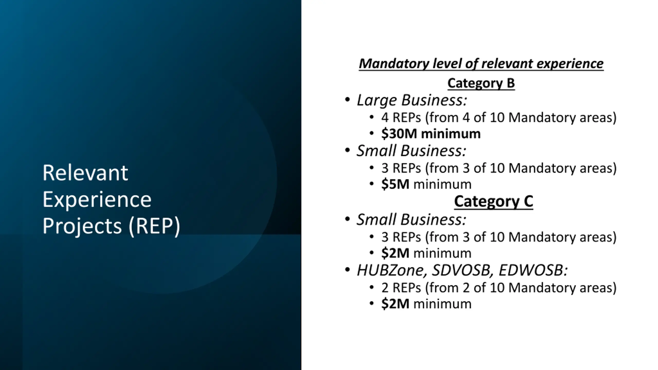 Mandatory level of relevant experience Category B Large Business: 4 REPs (from 4 of 10 Mandatory areas) $30M minimum Small Business: 3 REPs (from 3 of 10 Mandatory areas) $5M minimum Category C Small Business: 3 REPs (from 3 of 10 Mandatory areas) $2M minimum HUBZone, SDVOSB, EDWOSB: 2 REPs (from 2 of 10 Mandatory areas) $2M minimum Relevant Experience Projects (REP)