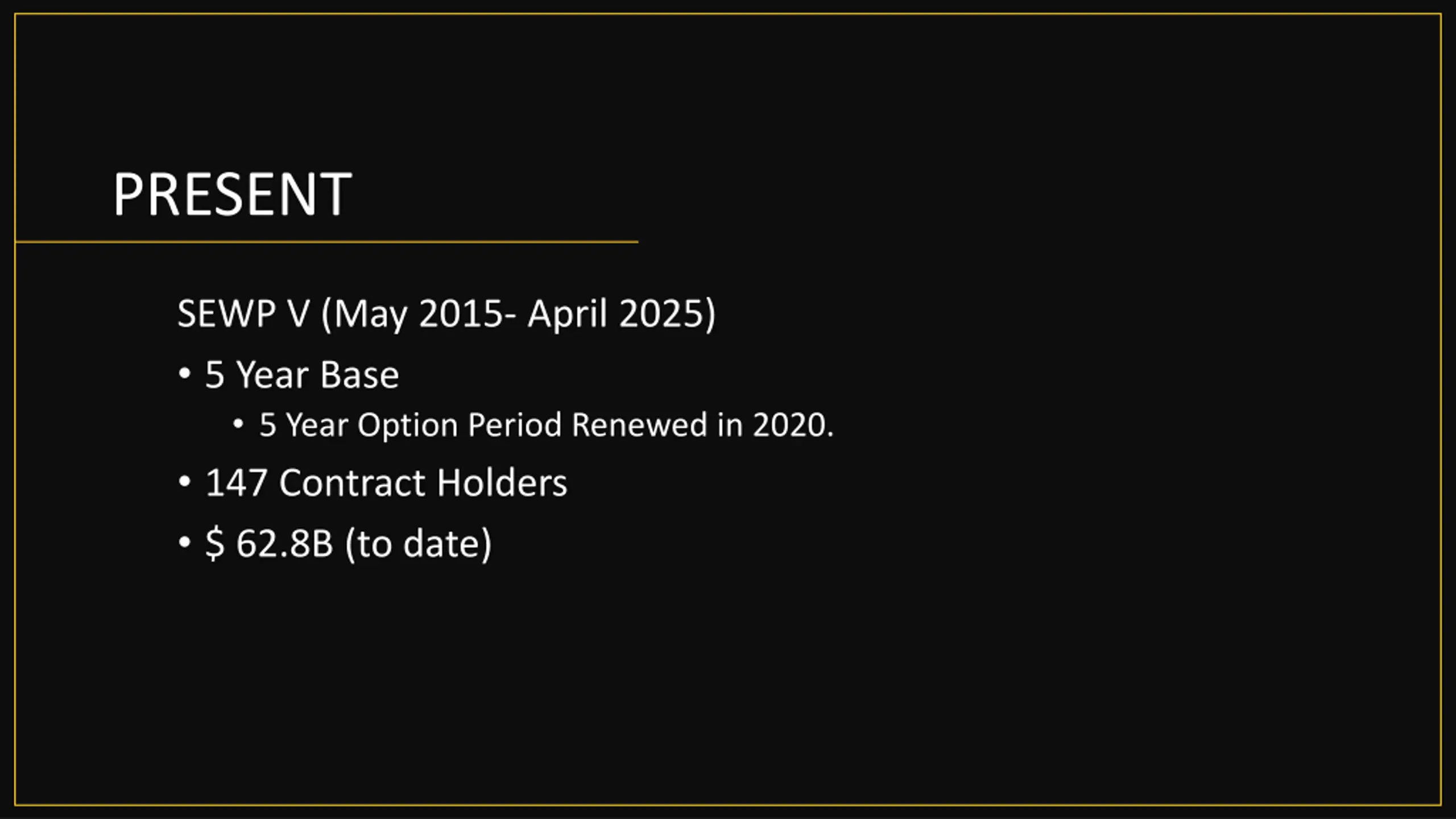 PRESENT SEWP V (May 2015- April 2025) 5 Year Base 5 Year Option Period Renewed in 2020. 147 Contract Holders $ 62.8B (to date)