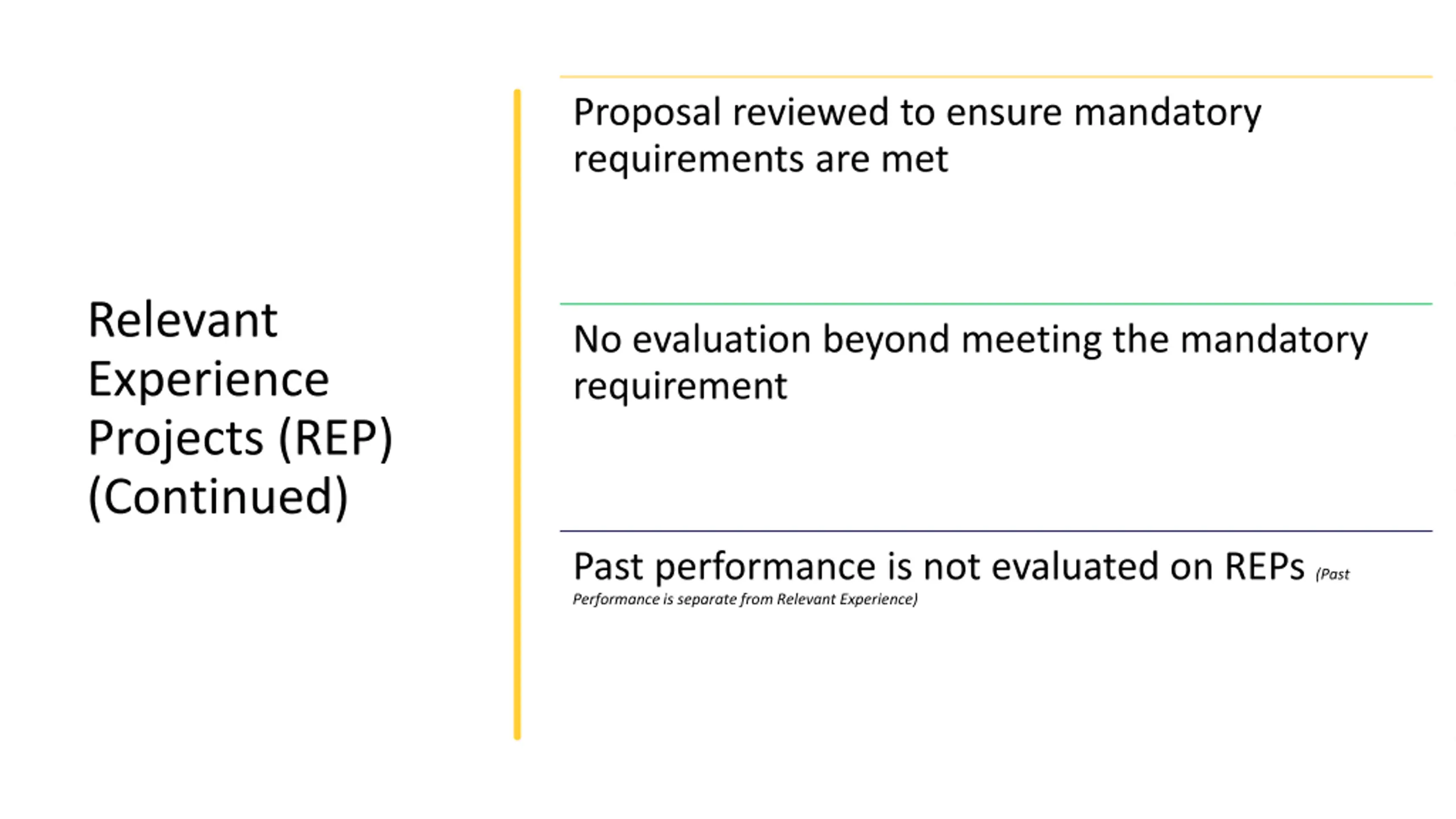 Proposal reviewed to ensure mandatory requirements are met Relevant Experience Projects (REP) (Continued) No evaluation beyond meeting the mandatory requirement Past performance is not evaluated on REPs (Past Performance is separate from Relevant Experience)