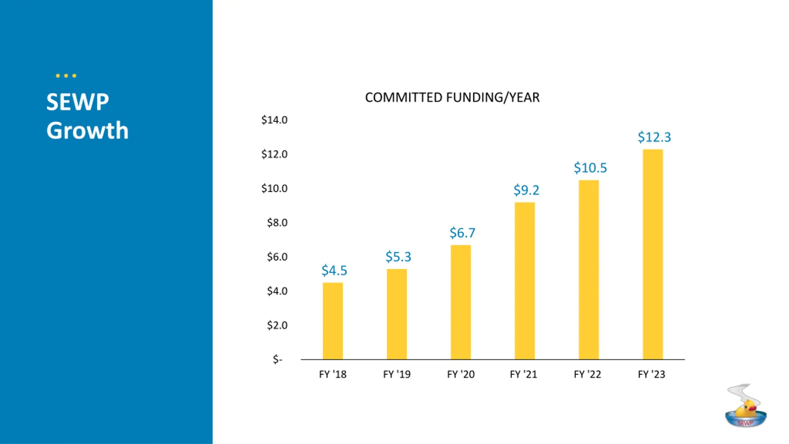 SEWP Growth COMMITTED FUNDING/YEAR $14.0 $12.3 $12.0 $10.5 $10.0 $9.2 $8.0 $6.7 $5.3 $6.0 $4.5 $4.0 $2.0 $- FY '18 FY '19 FY '20 FY '21 FY '22 FY '23