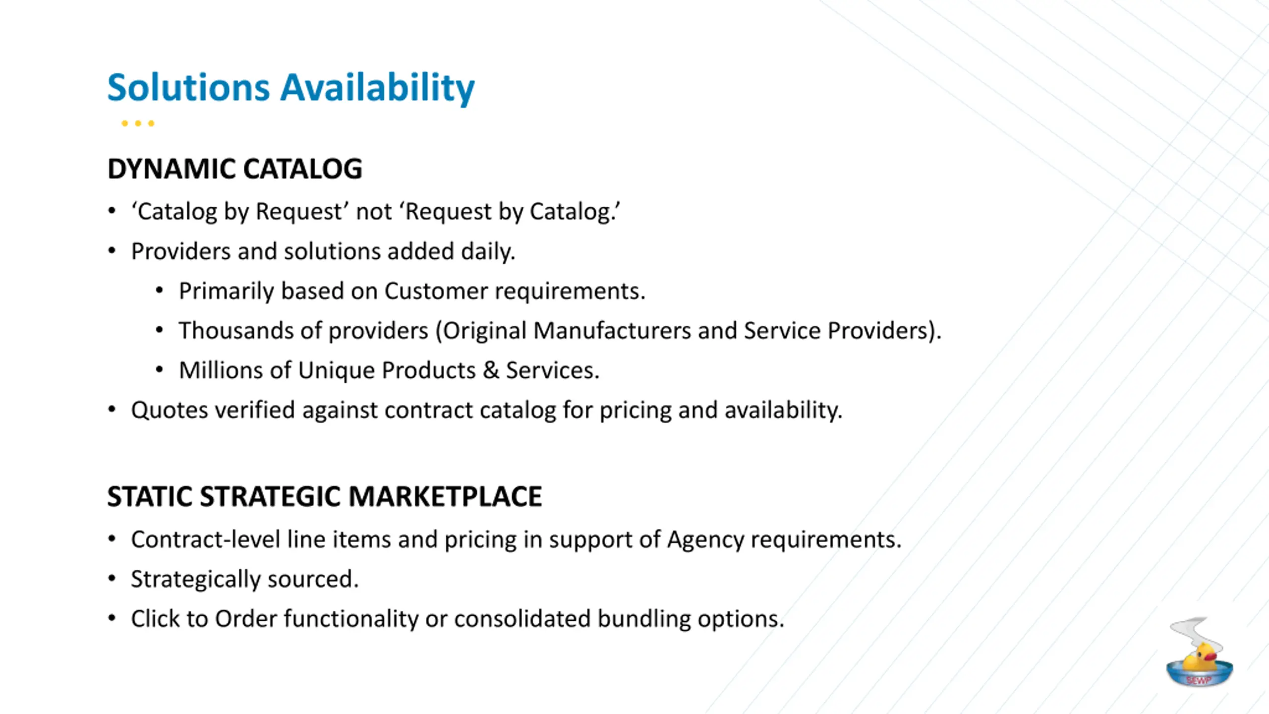 Solutions Availability DYNAMIC CATALOG Catalog by Request not Request by Catalog. Providers and solutions added daily. Primarily based on Customer requirements. Thousands of providers (Original Manufacturers and Service Providers). Millions of Unique Products & Services. Quotes verified against contract catalog for pricing and availability. STATIC STRATEGIC MARKETPLACE Contract-level line items and pricing in support of Agency requirements. Strategically sourced. Click to Order functionality or consolidated bundling options.