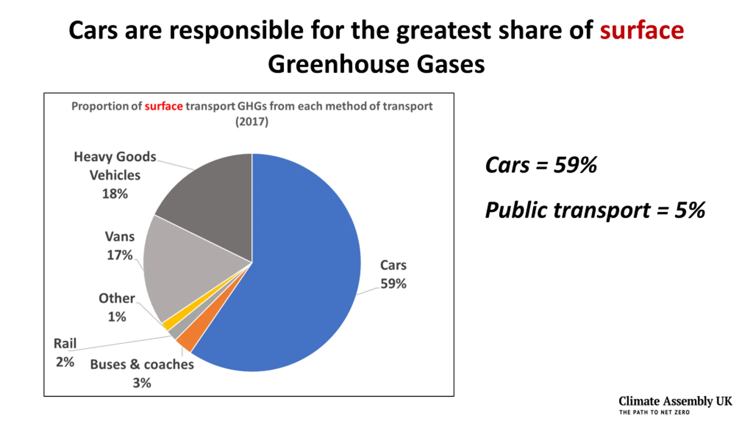 Cars are responsible for the greatest share of surface Greenhouse Gases Cars = 59% Public transport = 5%