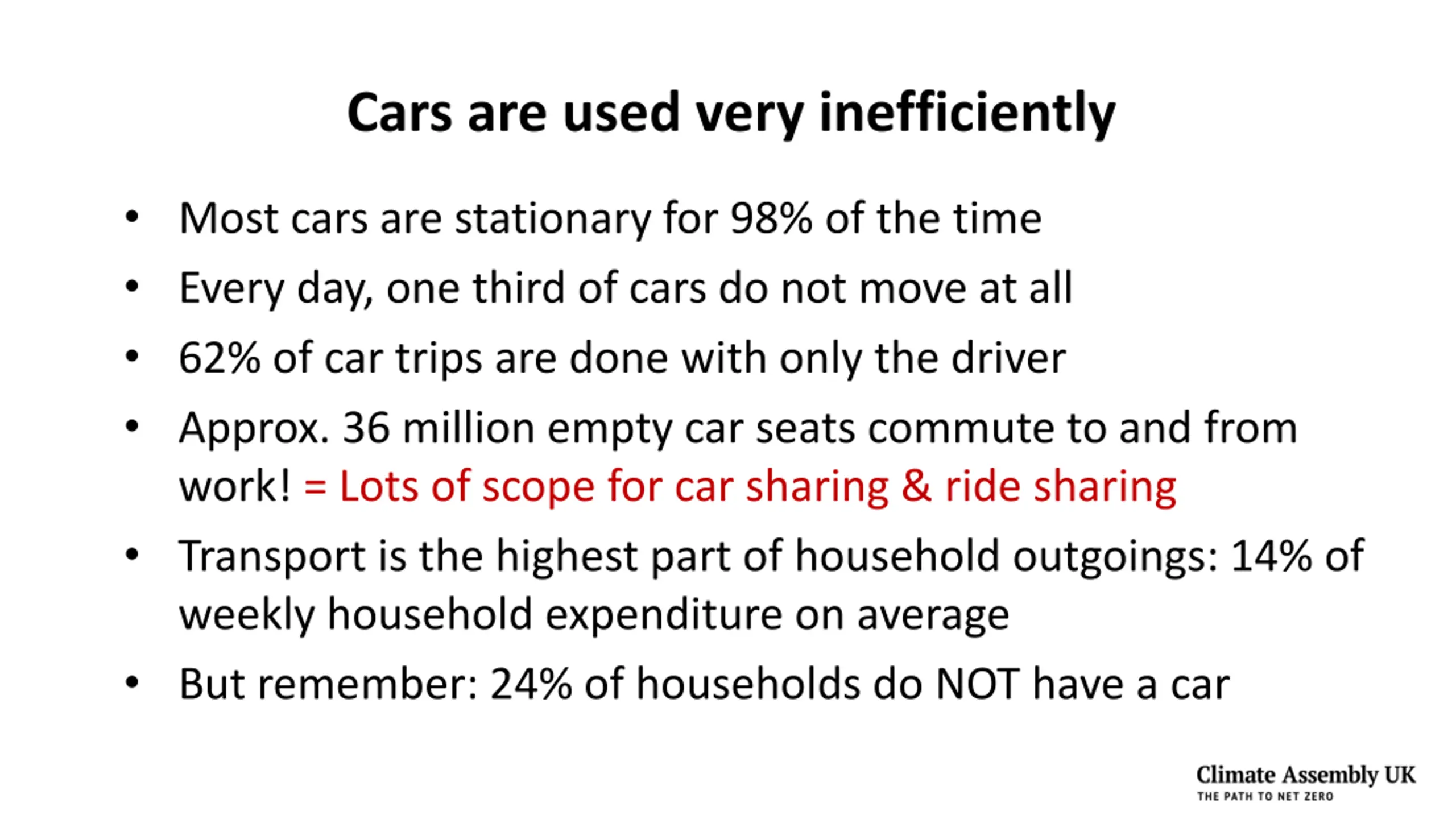 Cars are used very inefficiently Most cars are stationary for 98% of the time Every day, one third of cars do not move at all 62% of car trips are done with only the driver Approx. 36 million empty car seats commute to and from work! = Lots of scope for car sharing & ride sharing Transport is the highest part of household outgoings: 14% of weekly household expenditure on average But remember: 24% of households do NOT have a car